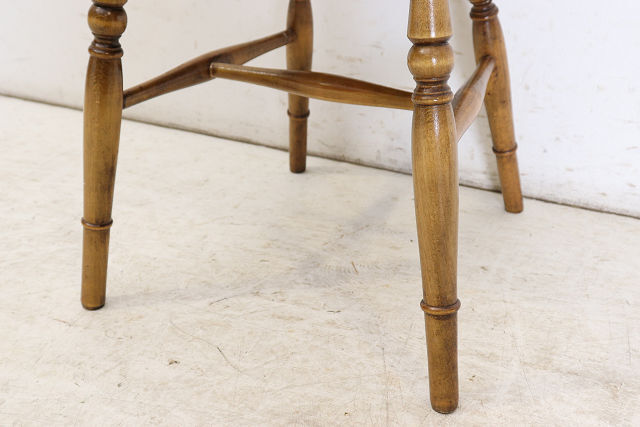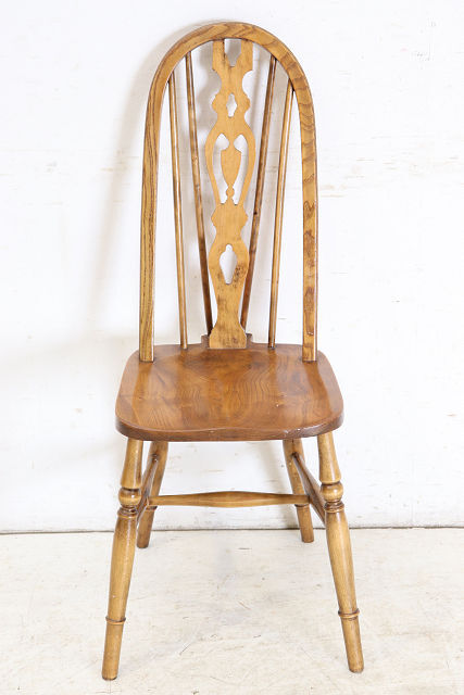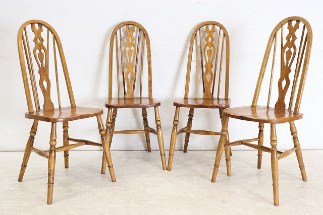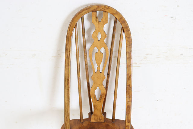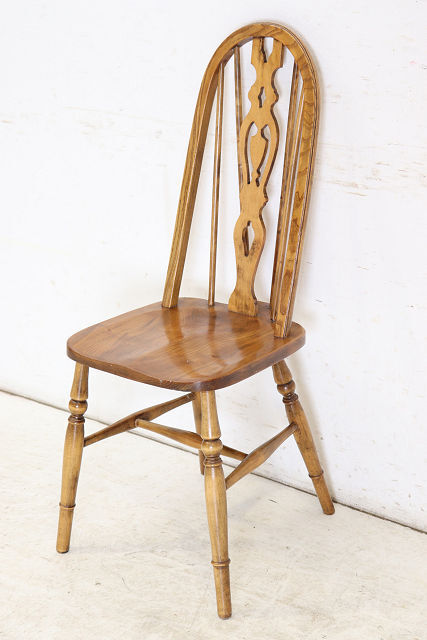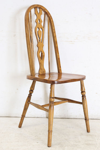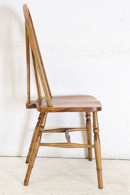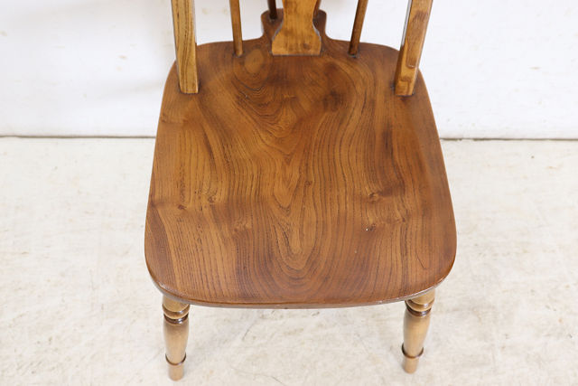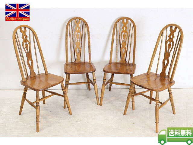 1960年代前後にイギリスで作られたビンテージのダ イニングチェアの4脚セットです。背もたれのデザ インからウインザーチェアとも呼ばれます。 その英国チェアの伝統的デザインはとても人気があ りイギリスでも高値で取引されています。少しモダ ンな雰囲気のテーブルやカントリーテイストにも合 いますので、一脚あればコーディネートの幅も広が ること間違いありません。 背もたれが高いので、テーブルと合わせた際の見た めのバランスも良く、座面は体にフィットするよう に加工されていますので長く座っても疲れにくい実 用的なおすすめの一品です。 <状態> 古いものですので全体に小さなキズや使用感等あり ます。ぐらつきやがたつきはありません。 塗装の塗り替えは行っておりませんので、キズや色 むら、日焼けや変色などありますのであらかじめご 了承ください。 不具合等ありましたら調整、修復して出荷いたしま すのでご安心ください。気になる点がございました らお気軽にお問い合わせください。 <年代> 1960年代前後 ※年代は大体の目安としてお考えください。 <素材> エルム材、金属、他 <サイズ> 横幅46cm×奥行50.5cm×高さ98.7cm 座面までの高さは45cm ※サイズは若干の誤差があります。 ◆こちらからも他の画像をご覧いただけます。 <送料> 日本全国送料はこちらで負担いたします。※一部の 地域、及び離島は除きます。離島は除きます。ヤマ ト運輸のらくらく家財宅急便を利用し、福岡から発 送いたします。このサービスは配達時に担当ドライ バーと助手が開梱、開梱廃材の持ち帰りまでするも のです。※一人で持てる小さな商品には助手はつき ません。 規格のダンボール箱に入る商品は通常の宅急便での 出荷となります。その場合は開梱、廃材の持ち帰り サービスはございません。運送保険をかけて発送い たしますが、万が一、破損等の荷物事故発生した場 合、全損、紛失以外は修理対応となります。また、 落札者様のご都合による返品にも対応いたしますが 、往復分の送料をご負担していただきますのであら かじめご了承ください。 <ご注意> こちらの商品は新品ではありません。アンティーク (ユーズド)であることを十分ご理解していただいた 上でのご注文をお願いいたします。仕上げにシェラ ックニスを使用しているため熱い物や水気のある物 を長時間のせたままにしておくとシミや色むらにな りますのでお気をつけください。 ※出荷からお届けまで10日ほど要します。 お問い合わせフリーダイヤル 0120-088-258 担当:高橋 | |