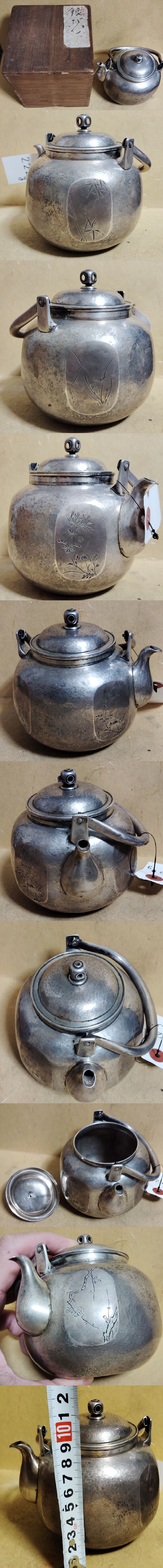 銀湯沸 銀壺 銀瓶 四君子 梅蘭竹菊 浮彫 煎茶 銀瓶 利久 在銘 重量219g共箱