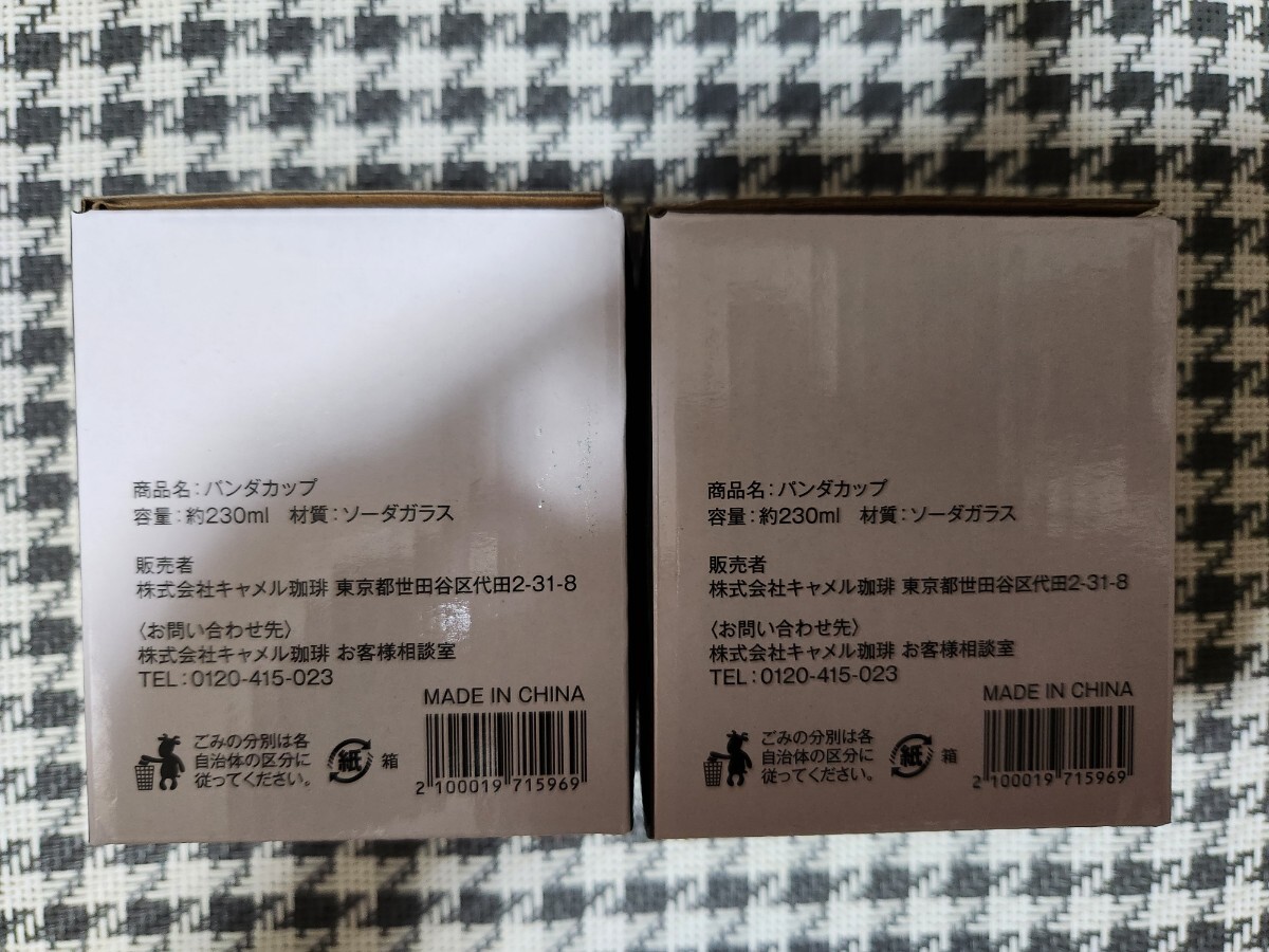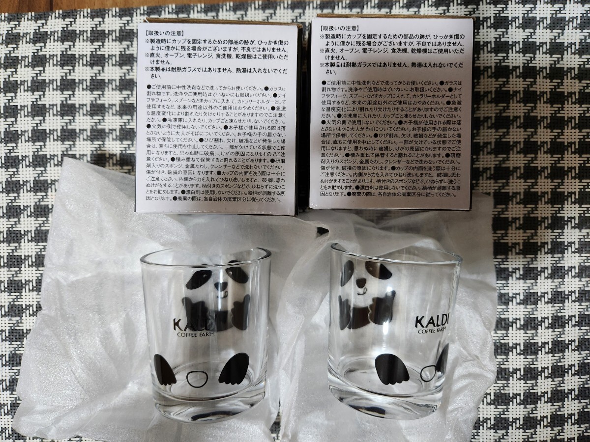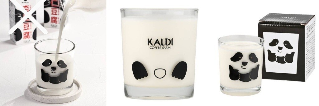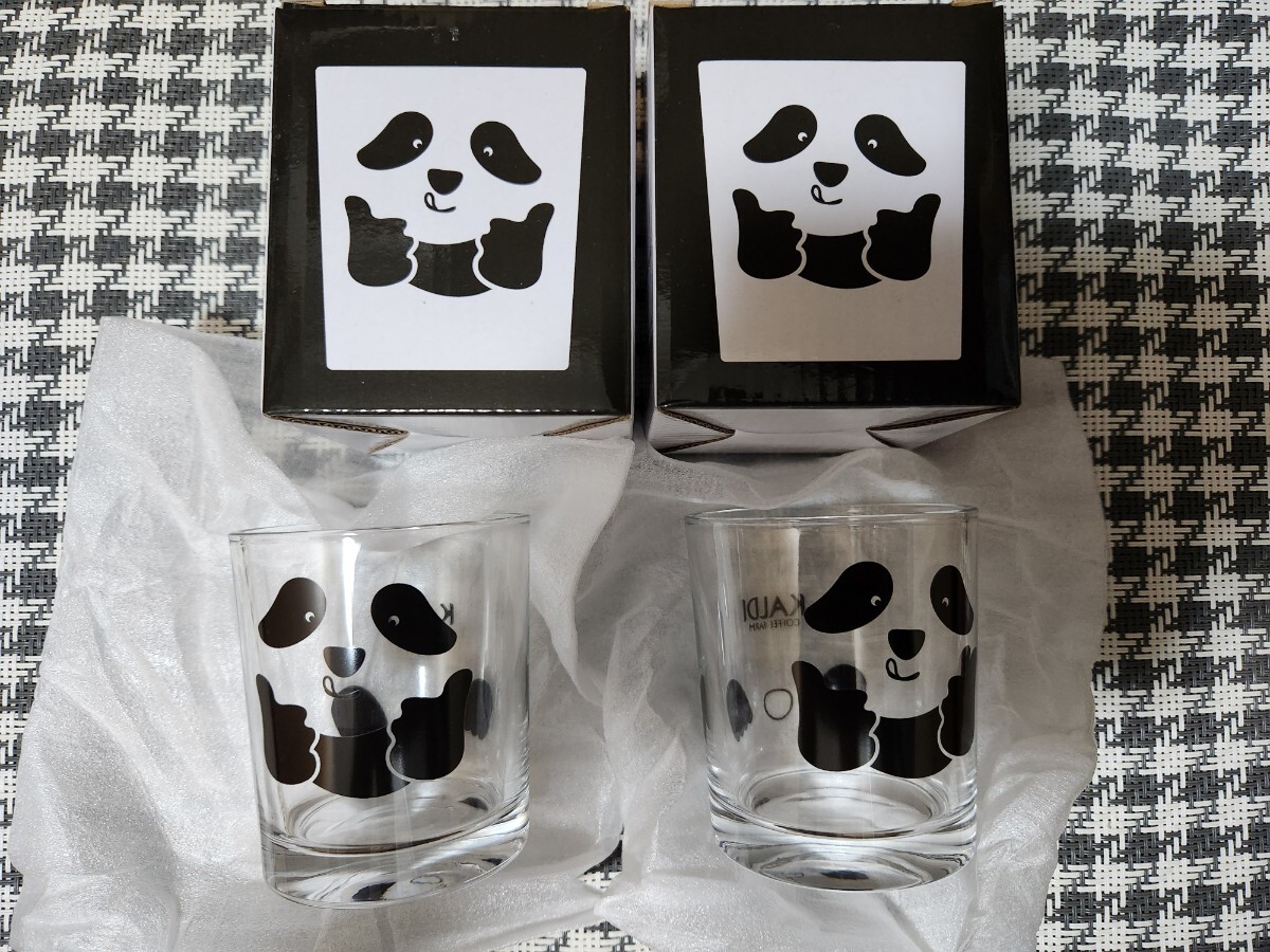 正面にパンダの顔と手を、裏側にはパンダの後ろ足としっぽを描いたグラス。容量約230ml、素材はソーダガラス。