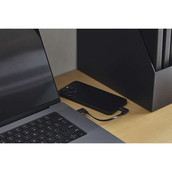 | ●出っ張りの少ないL字プラグを両端に採用し、充電の際に邪魔になりにくい設計です | |