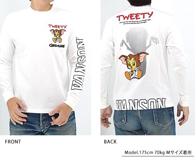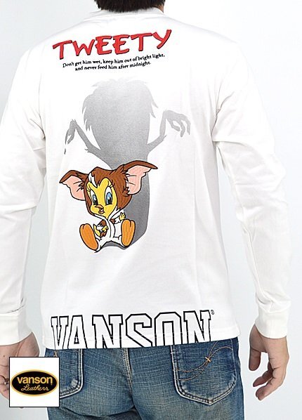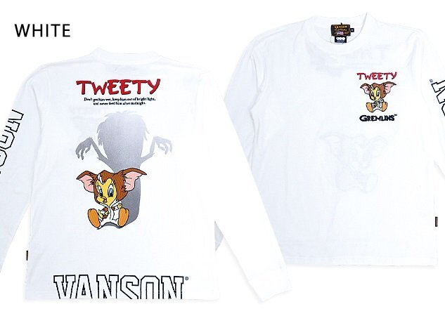 上質なレザーを使って生み出された数々のアイテムがバイカーに大人気のvansonから「vanson×LOONEY WARNER BROS.100周年記念モデル 天竺ロングTシャツ(LTV-2402)」のご紹介です。 アメリカのワーナーブラザーズが製作するアニメーション【LOONEY TUNES】の人気キャラクターをモチーフにしました! 今回のデザインの主役は、可愛らしい外見からは想像出来ない腹黒さを持つカナリアのキャラクター【トゥイーティー】です。 LOONEY TUNESを制作するワーナーブラザース社100周年を記念したスペシャルモデル! 今回は同社が映画配給を手掛けたSF映画「グレムリン」を合わせた、特別バージョンです。 背中にはグレムリンの着ぐるみを身に着けたトゥイーティーが刺繍で描かれています。 バックにしっかり柄を入れている分、フロントはシンプルに仕上げ、メリハリを付けました。 左袖にはブランドロゴをライン状にプリントしています。 ボディーには、綿100%の天竺Tシャツ生地を採用。 | |||||||||||||||||||||||||