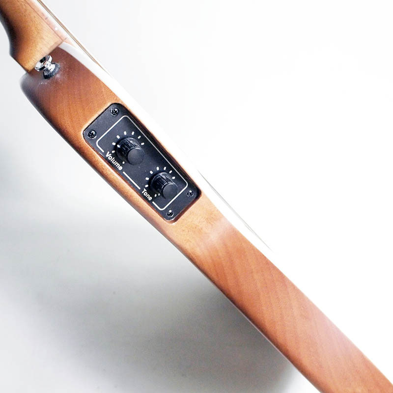 指板とサウンドホールの間にはシングルコイルサイズのピックアップがマウントされており、コントロールは4弦側のボディサイドに配してあります。