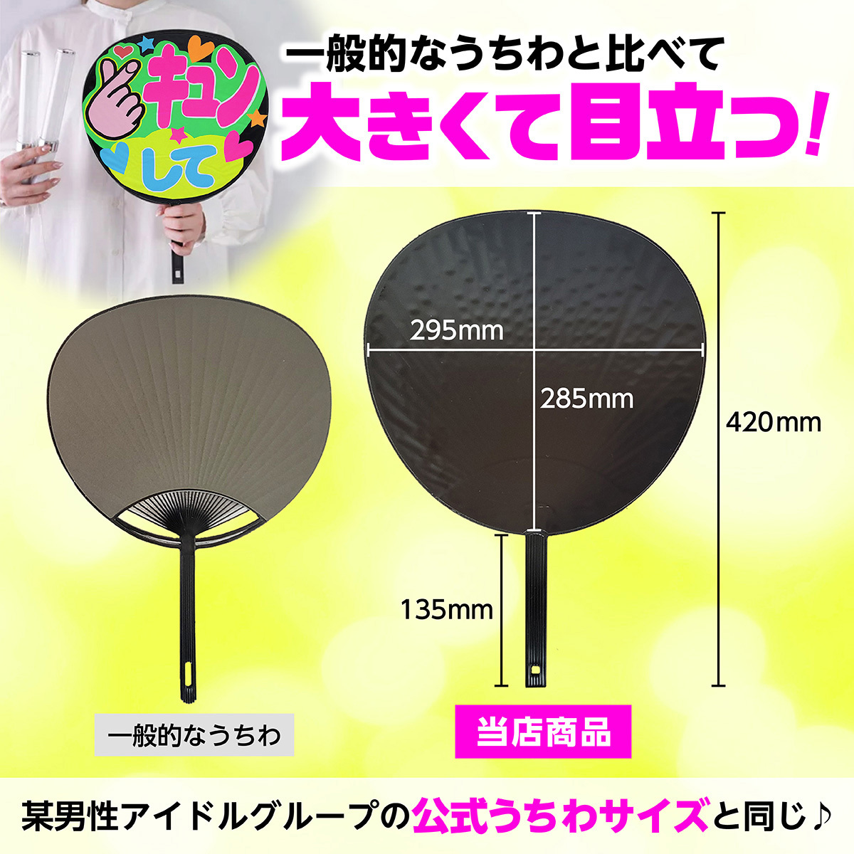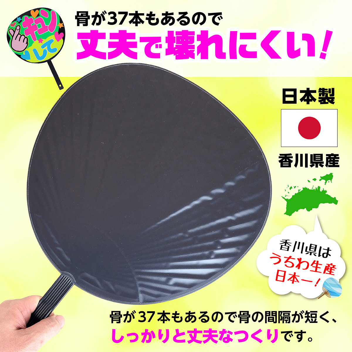 | 説明 | コンサートや応援グッズにおすすめの大きいサイズの黒うちわです。 両面張りで、応援メッセージなどをたっぷり書くことができます。 コンサートやライブはもちろん、運動会やスポーツ観戦の応援グッズとしておすすめです。 |