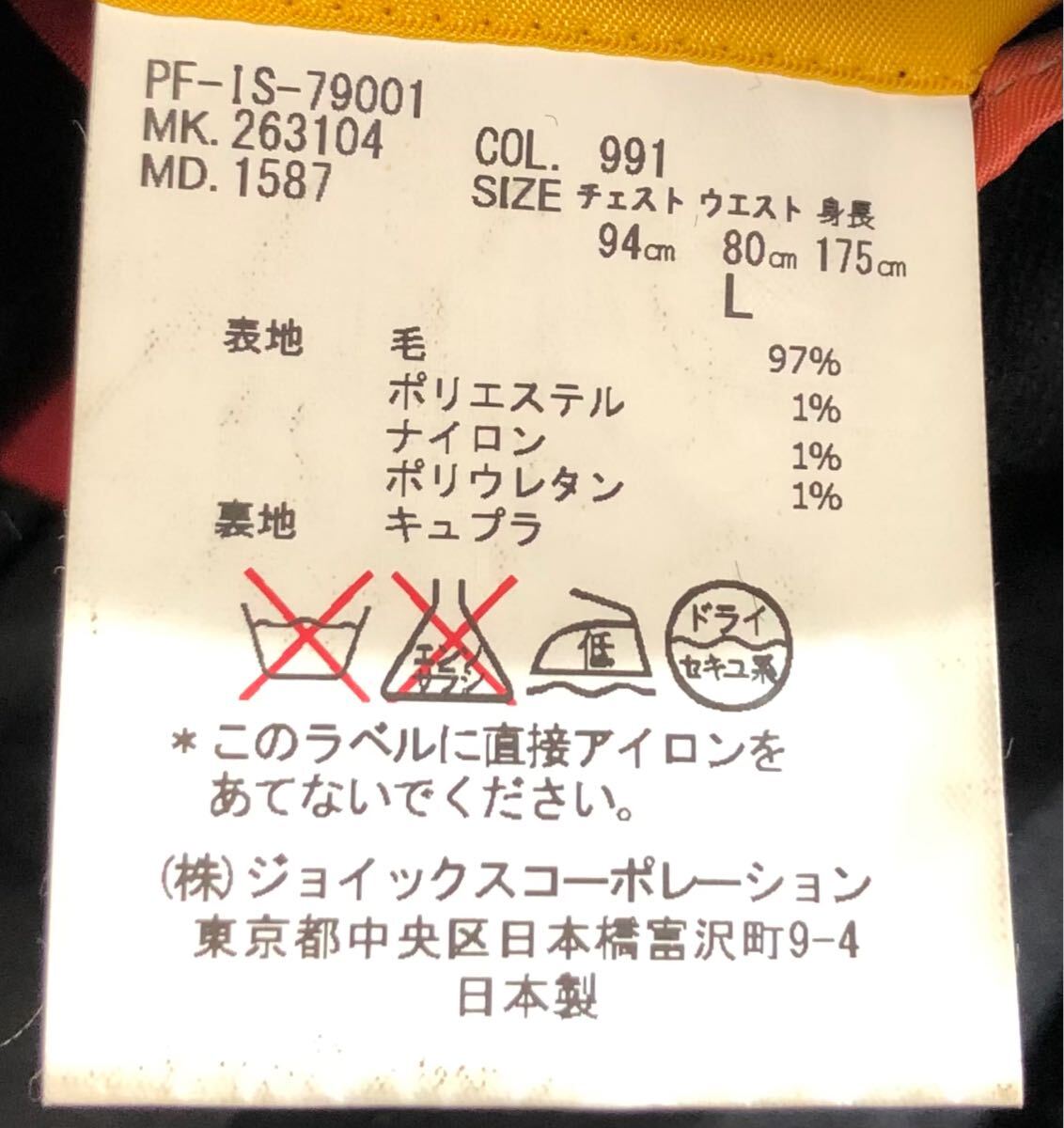 素材 【 表地-毛-97%/ポリエステル-1%/ナイロン-1%/ポリウレタン-1%/裏地-キュプラ 】