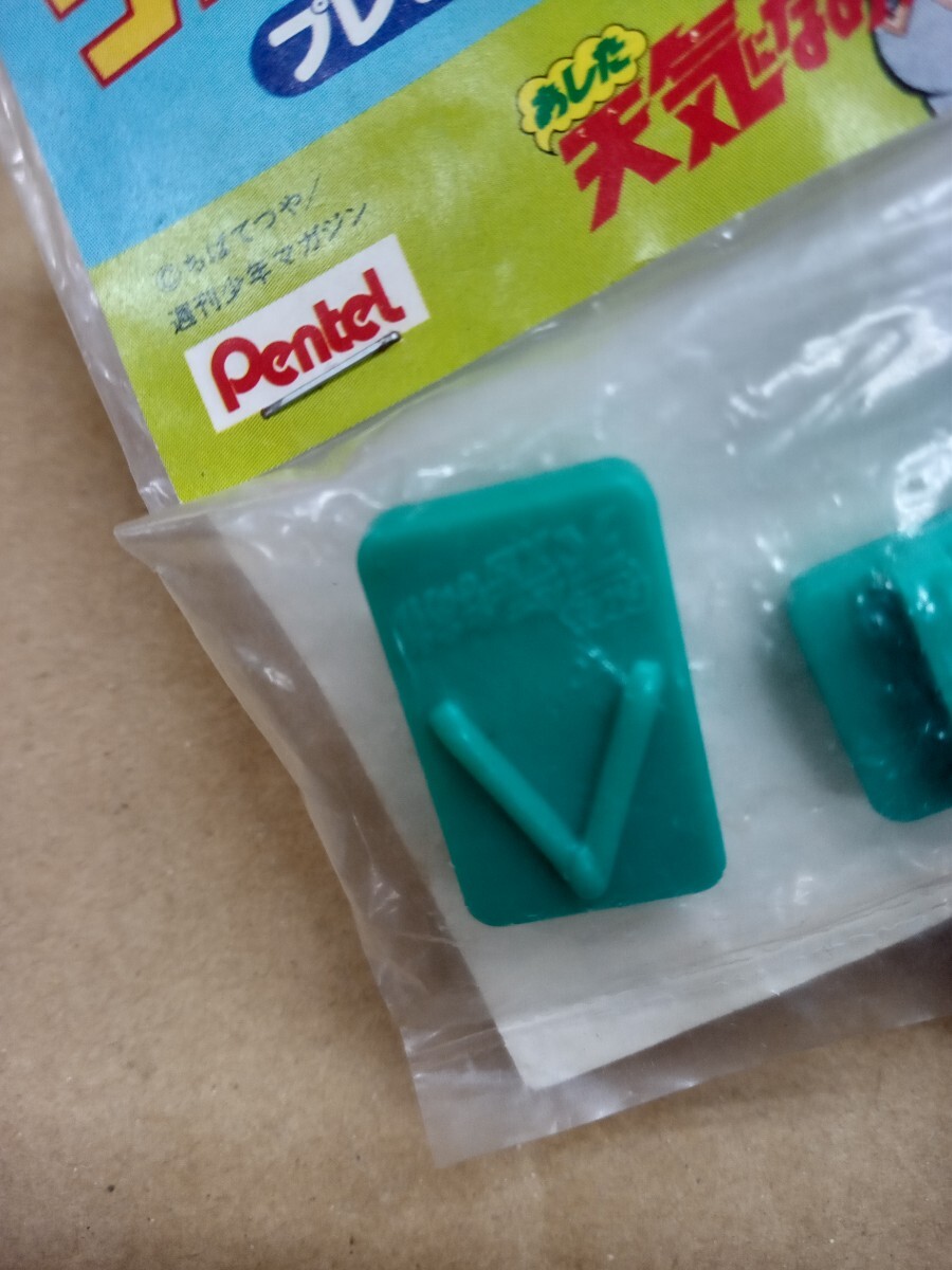見た目的には消しゴムっぽく見えますが、プラスチックですね。よーく見るとアニメのロゴが入っており、なかなかこだわった造りです。