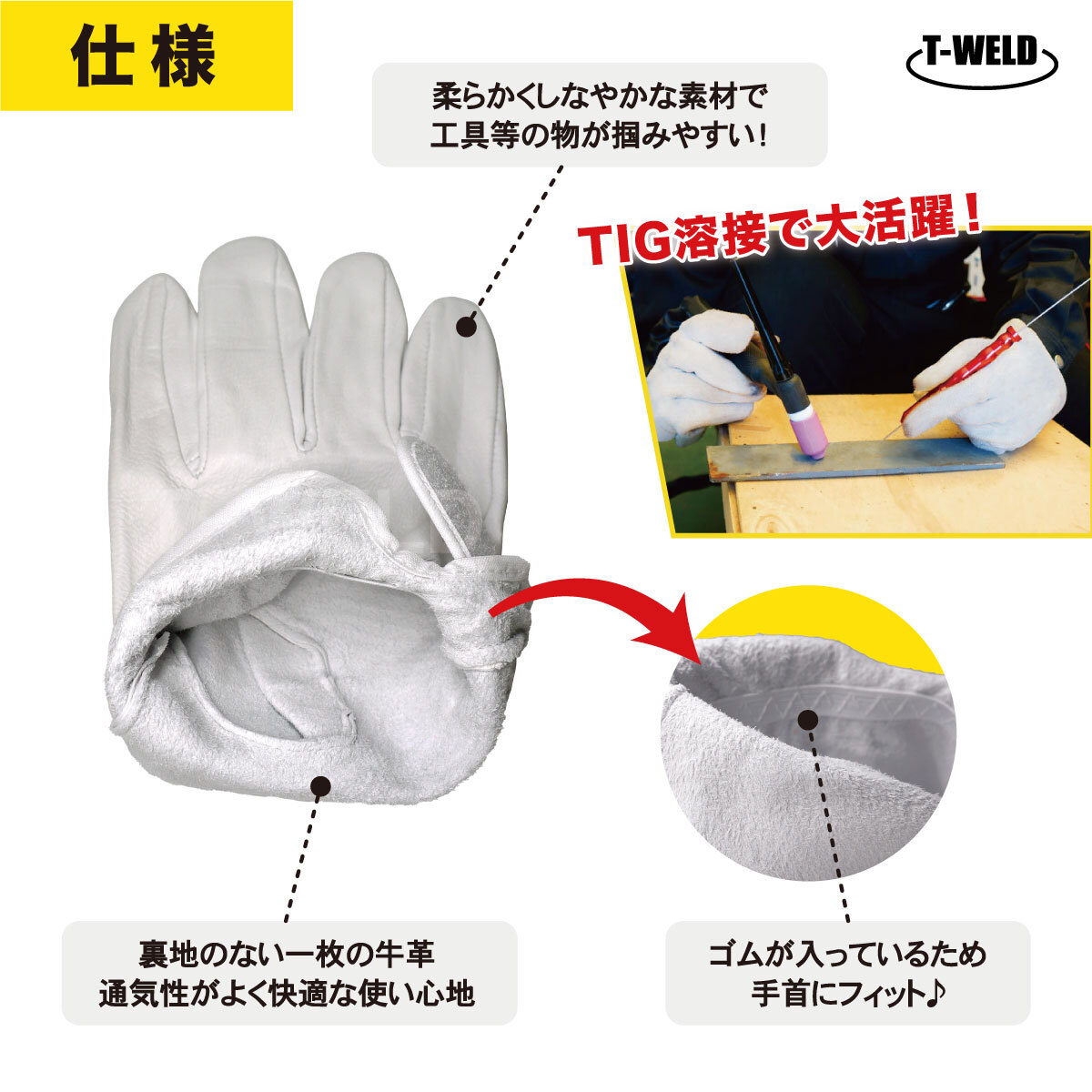 TIG 溶接 鉄鋼 建設 作業用 マジックテープ式 豚クレスト 手袋 5本指