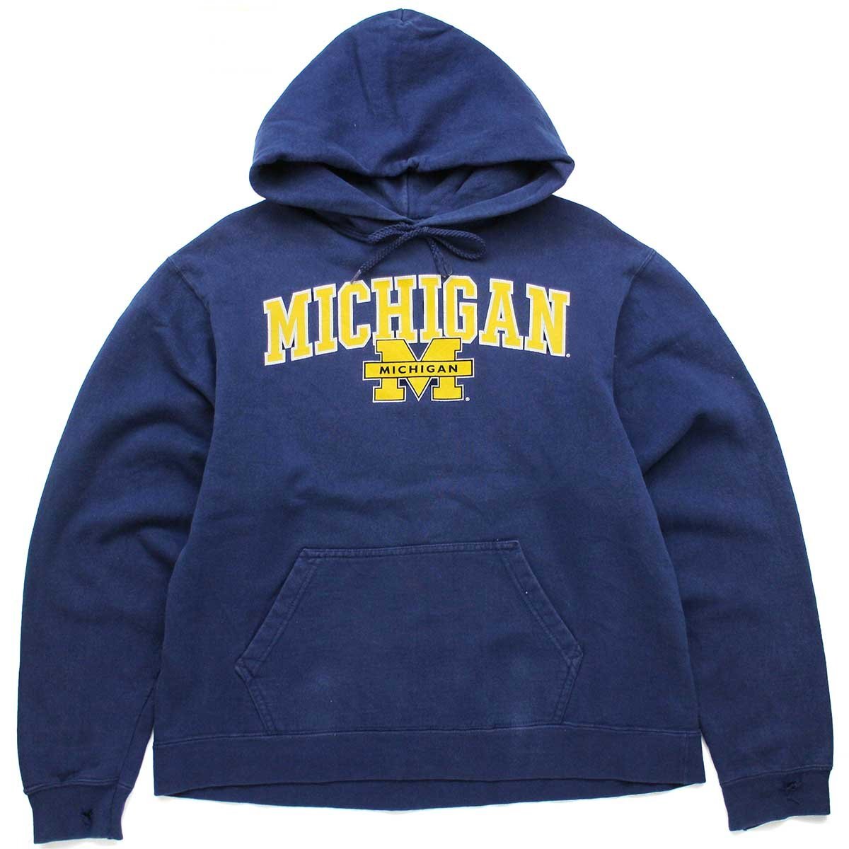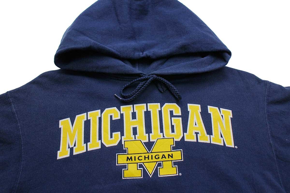 ★00s メキシコ製 Hanes MICHIGAN スウェットパーカー 紺 M★オールド フーディー ミシガン カレッジ ネイビー ダメージ