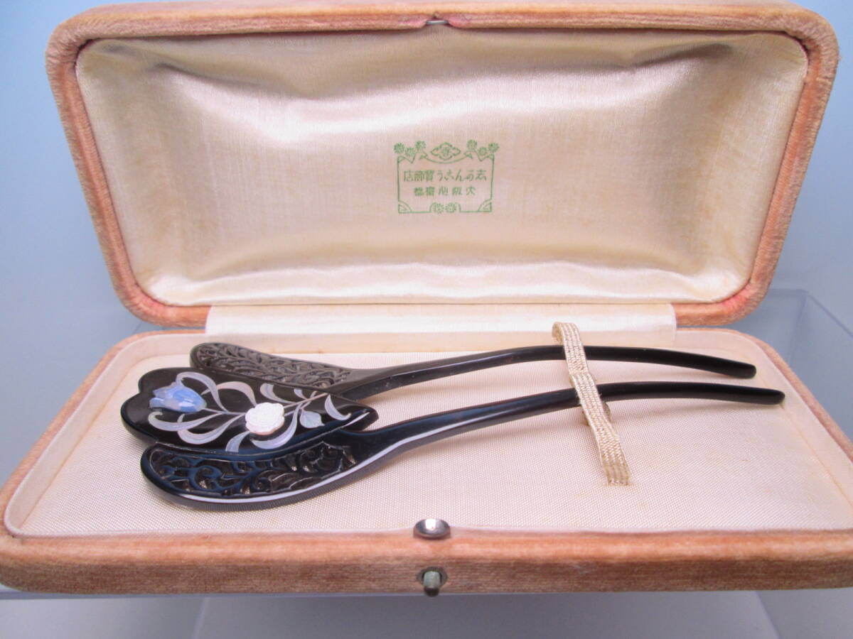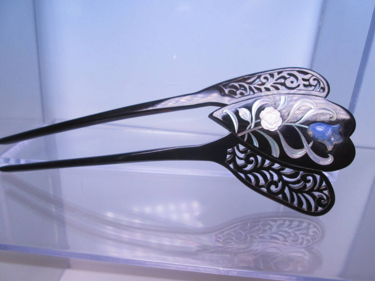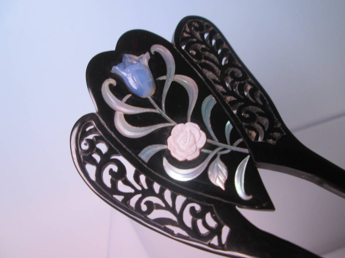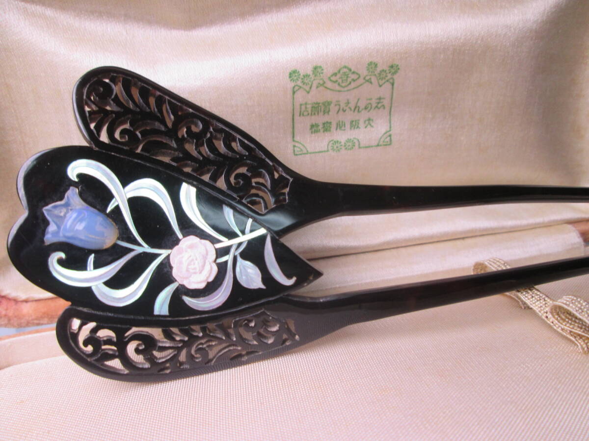 【江月】アンティーク・芝翫香 本べっ甲 螺鈿細工オパール飾り チューリプと薔薇文唐草透かしかんざし 共ケース付