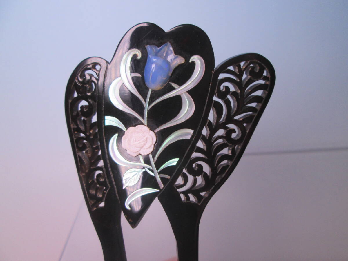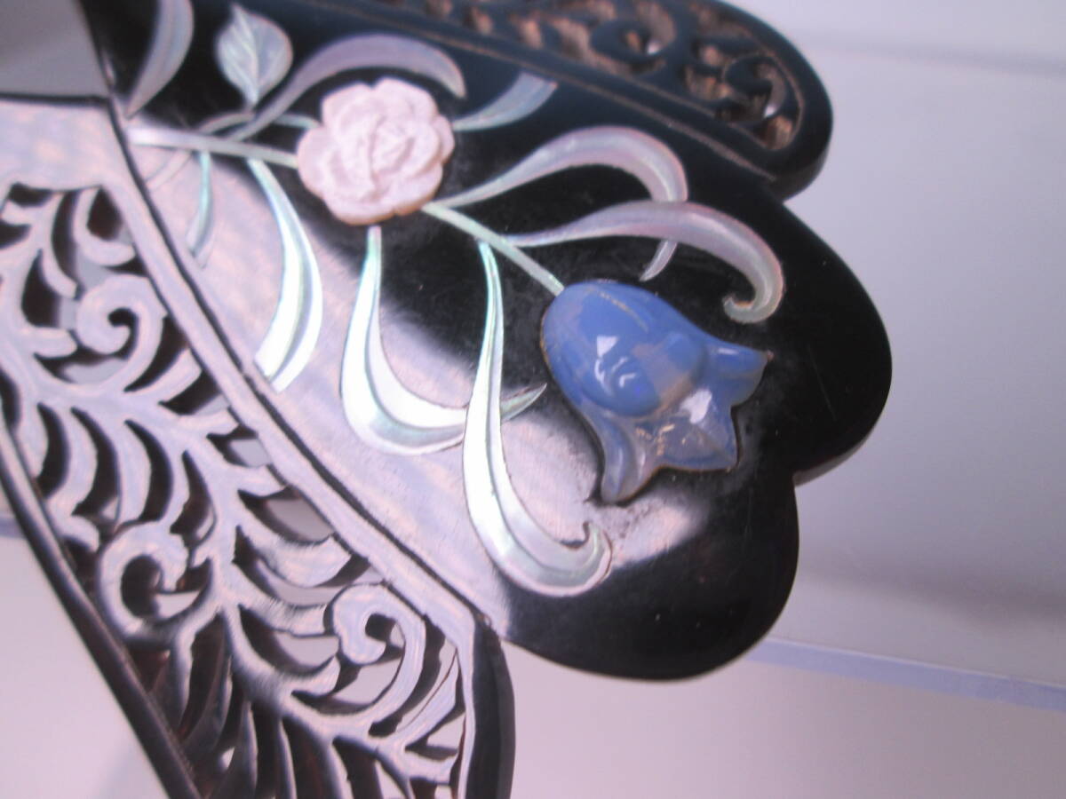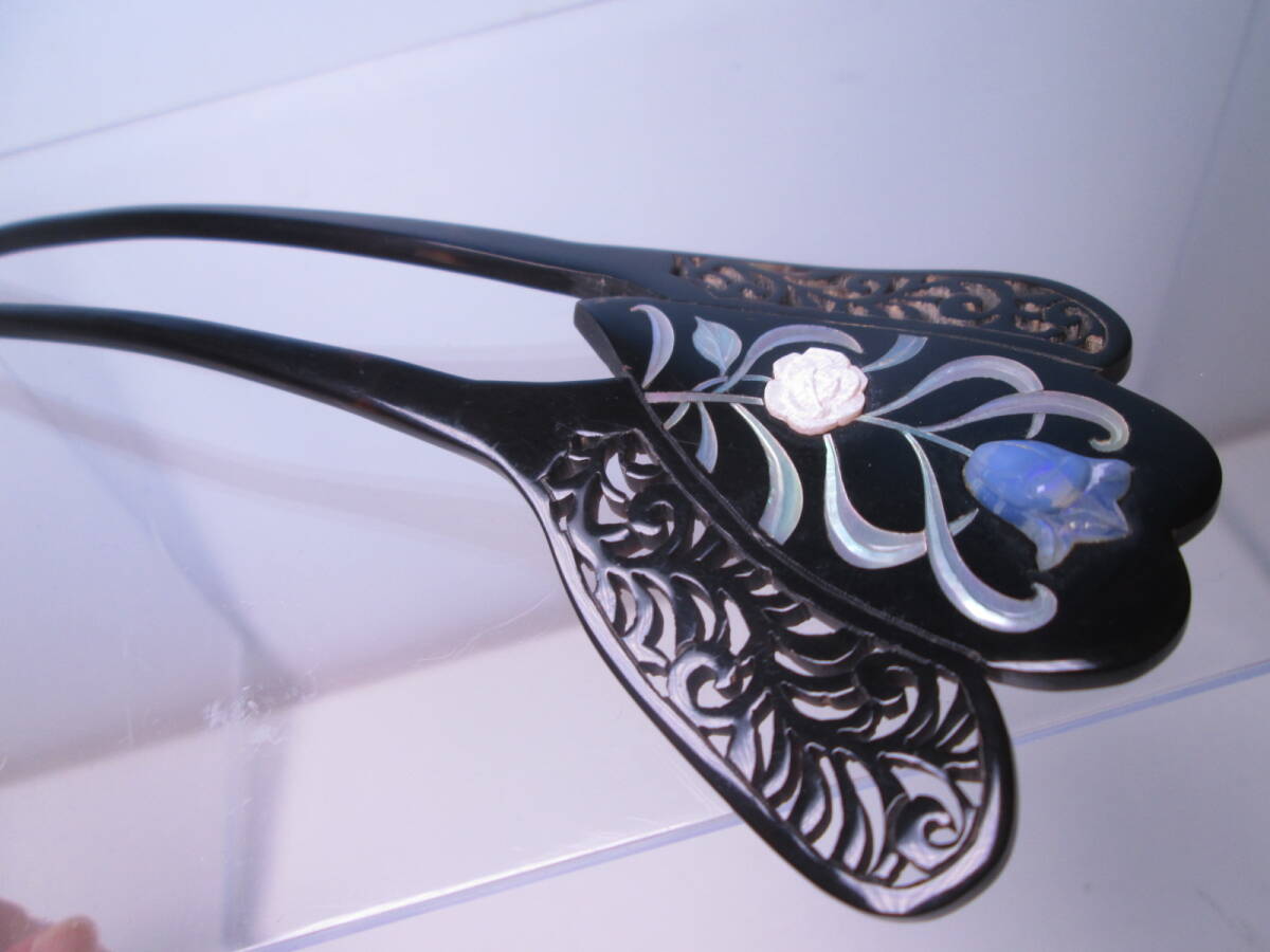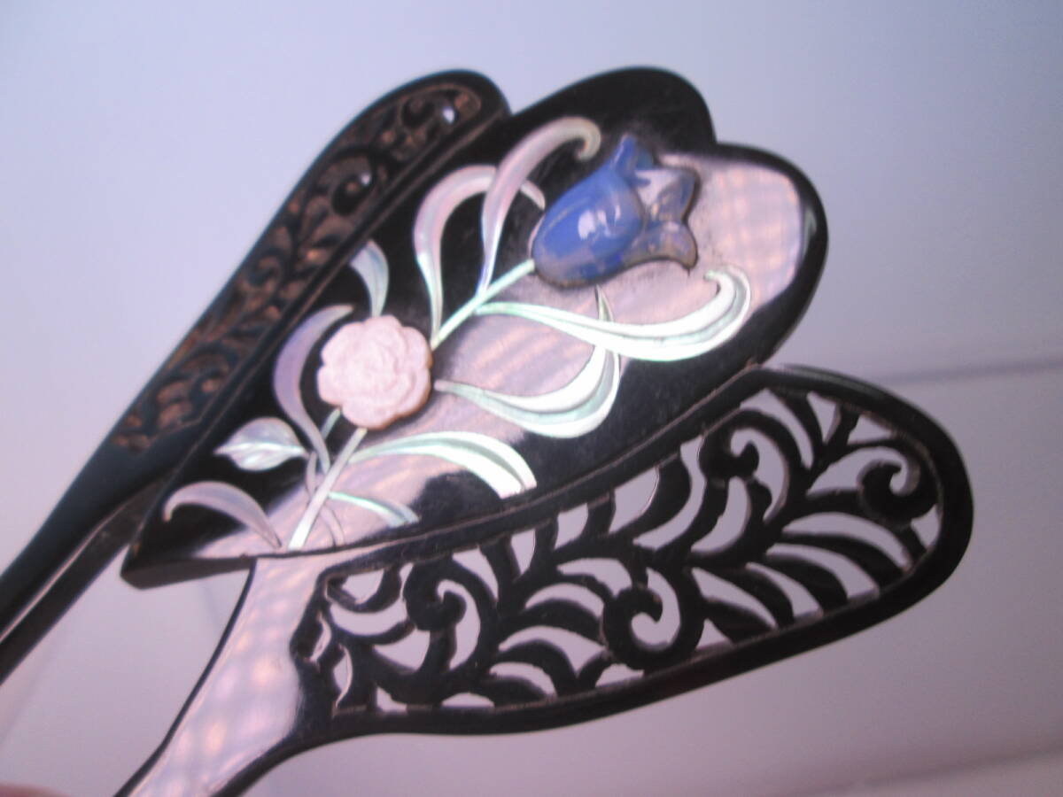 【江月】アンティーク・芝翫香 本べっ甲 螺鈿細工オパール飾り チューリプと薔薇文唐草透かしかんざし 共ケース付