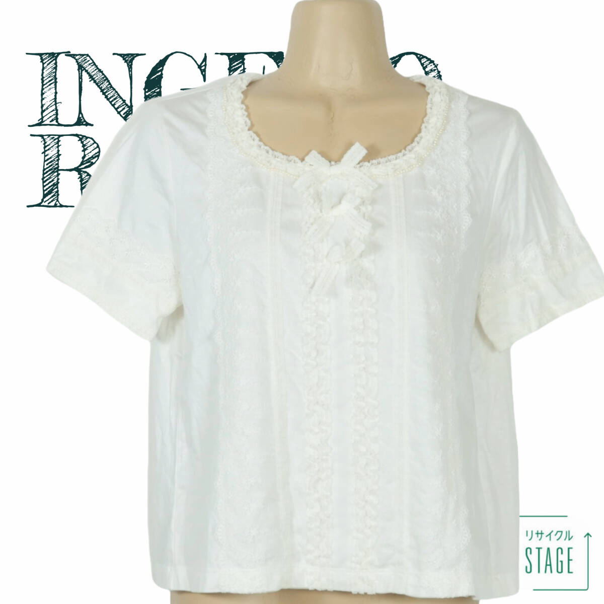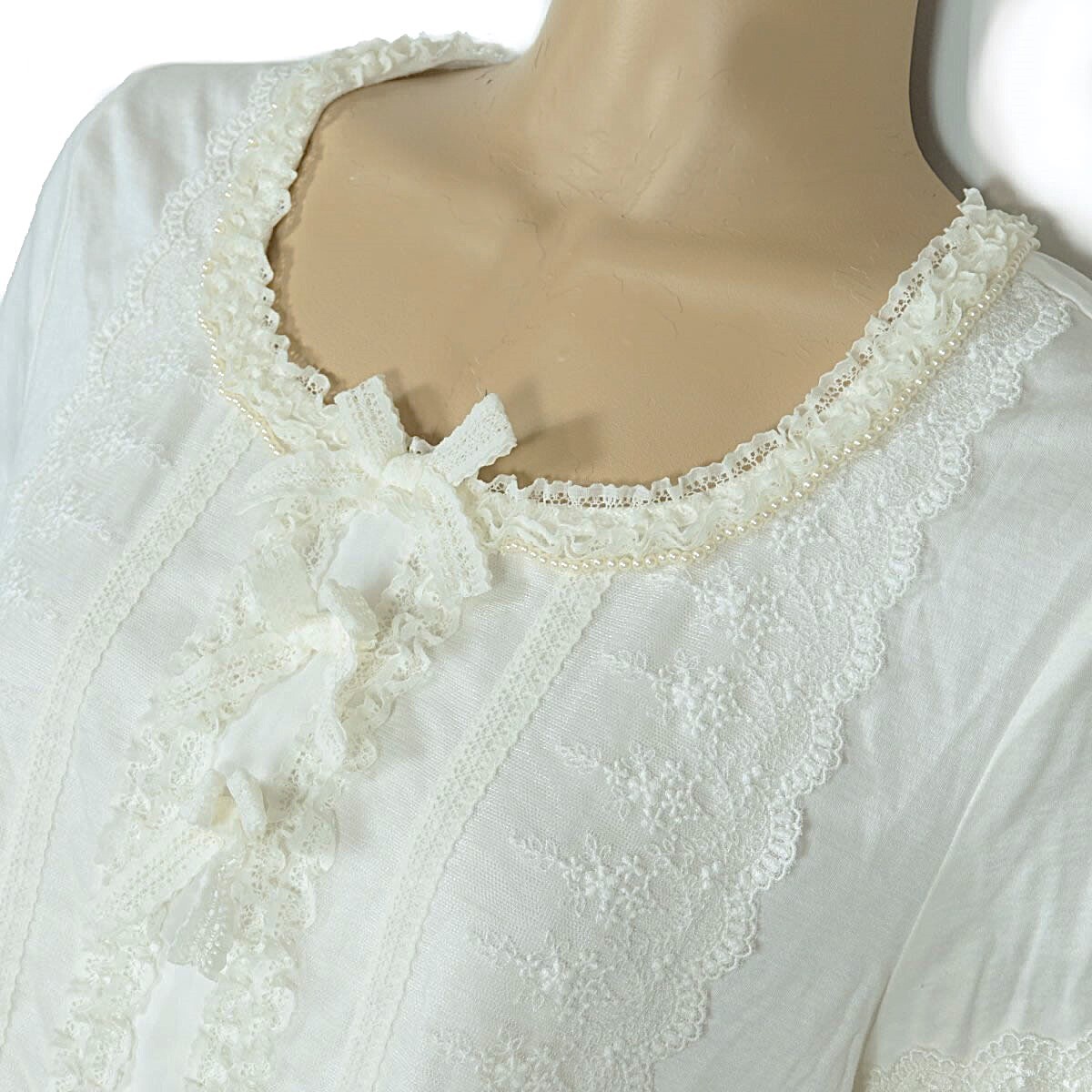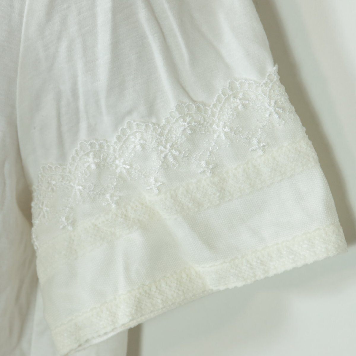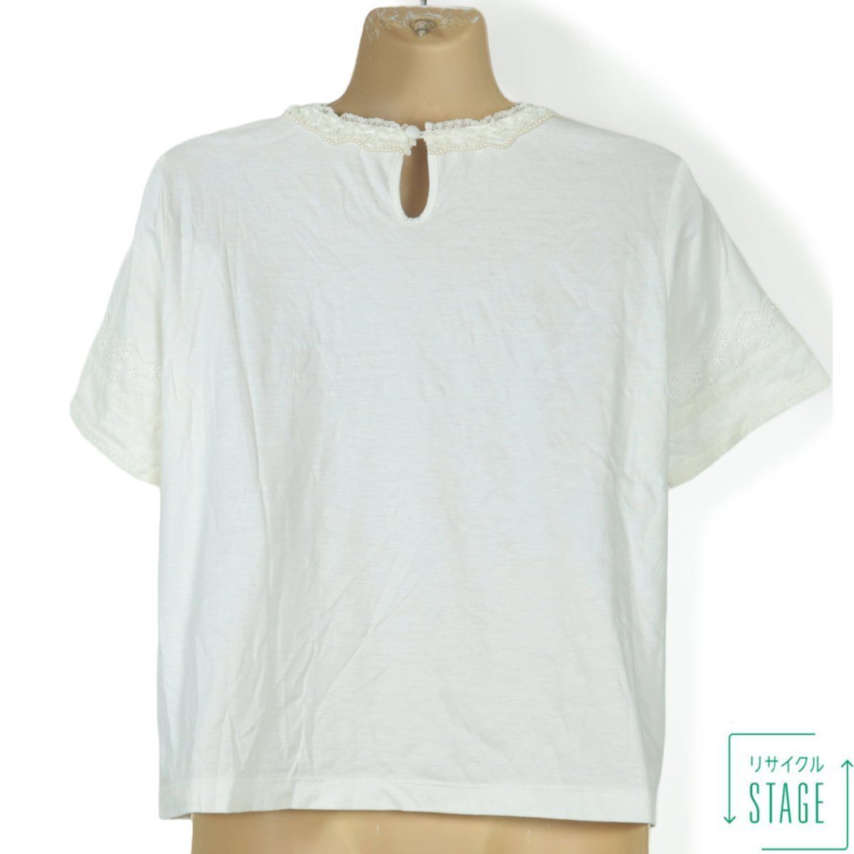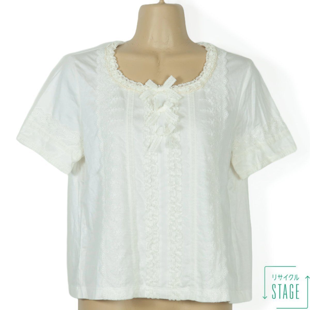 商品説明 | 【実寸約】肩幅38袖丈20バスト92着丈48(cm) 【サイズ表記】 3(9号) 【素材】 再生繊維(リヨセル)70綿30 【状態】普通の使用感のあるお品物 【デザイン】 ホワイト系 レース飾りがいっぱいついた半袖カットソーです。 ネックレスのようなパールビーズがエレガント♪ レースのリボン3つ付き♪ ポケットなし。裏地なし。肩パッドなし。 首の後ろに一つボタンあり。 これ一枚でもレイヤードでもロマンティックコーデに大活躍するアイテムです。 |