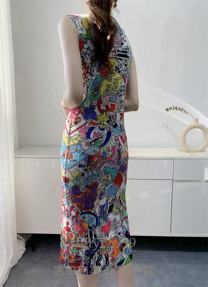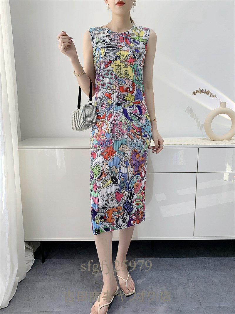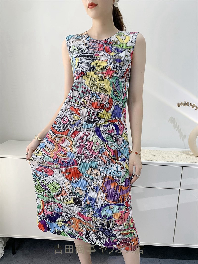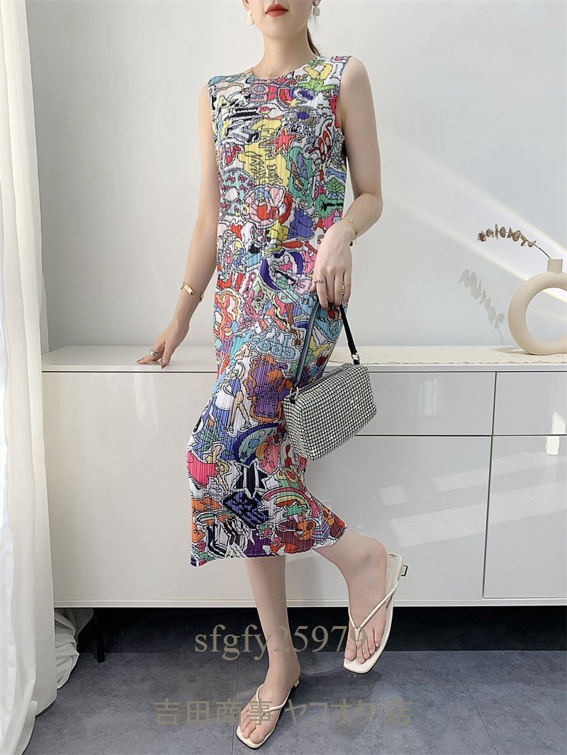 B0139☆新品大人気 レディーストップス プリーツワンピース チュニック ノースリーブ 中長丈 弾力がありドレープ性いい 素敵花柄