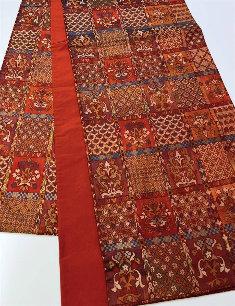 格子の中に有職文様風な文様や欧風な文様が織り出されています。