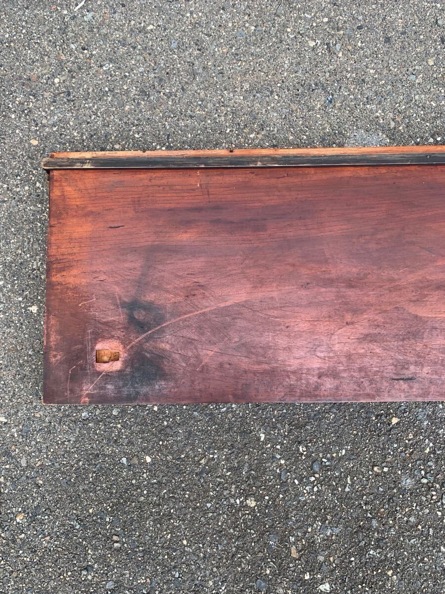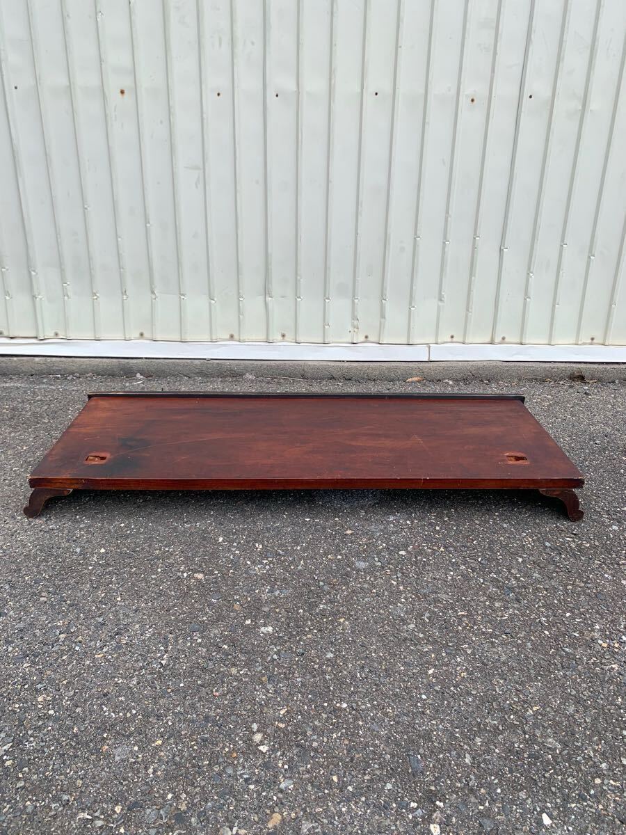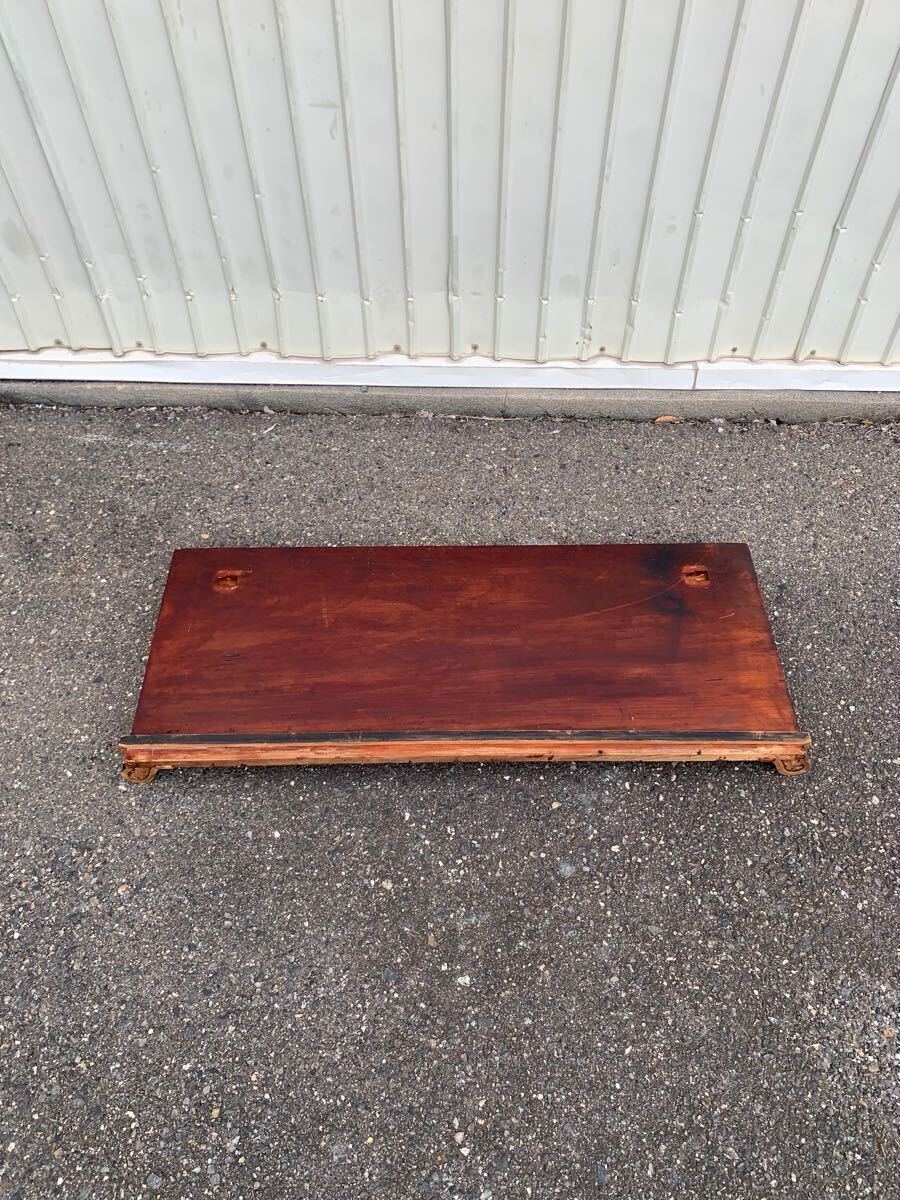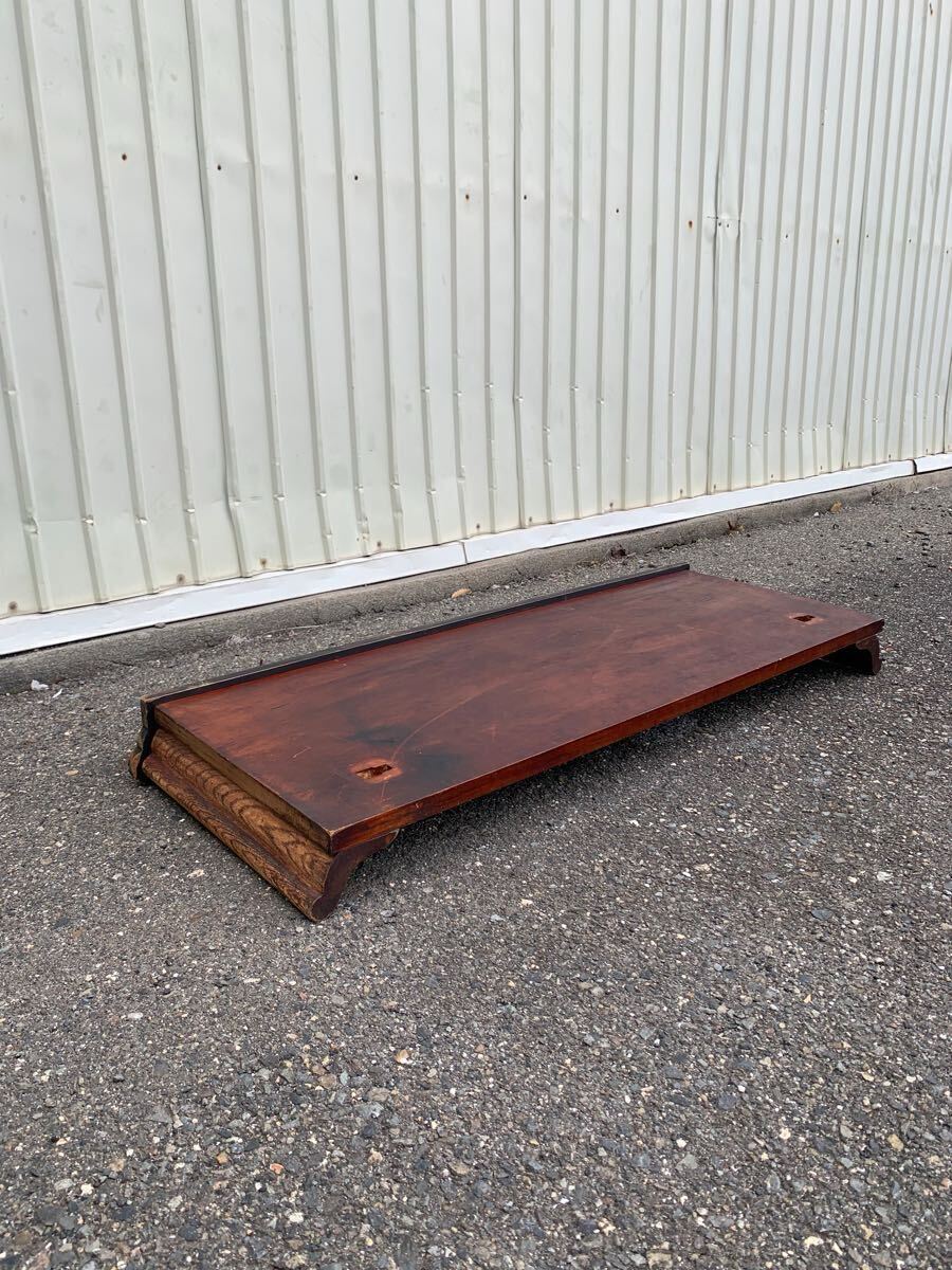 経年の雰囲気が素敵な脚付木製展示台です。しっかりした造りで、天板は無垢材の一枚板で厚み約2.2cmあります。脚の造りも凝っています。小物やアクセサリー、植物などを置いて、お部屋のインテリアや、お店やイベント出店時の什器として使って頂くと素敵だと思います。