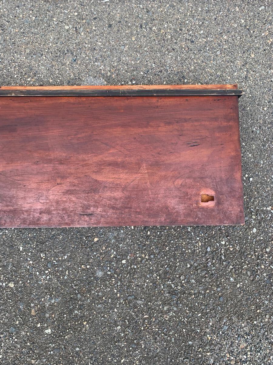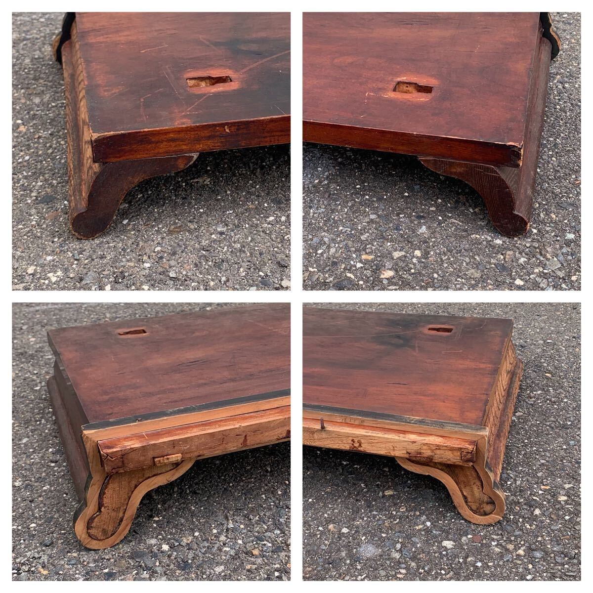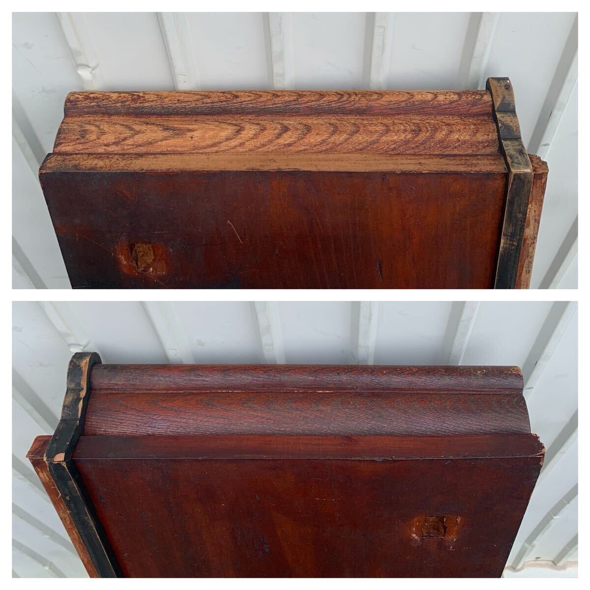 経年の雰囲気が素敵な脚付木製展示台です。しっかりした造りで、天板は無垢材の一枚板で厚み約2.2cmあります。脚の造りも凝っています。小物やアクセサリー、植物などを置いて、お部屋のインテリアや、お店やイベント出店時の什器として使って頂くと素敵だと思います。
