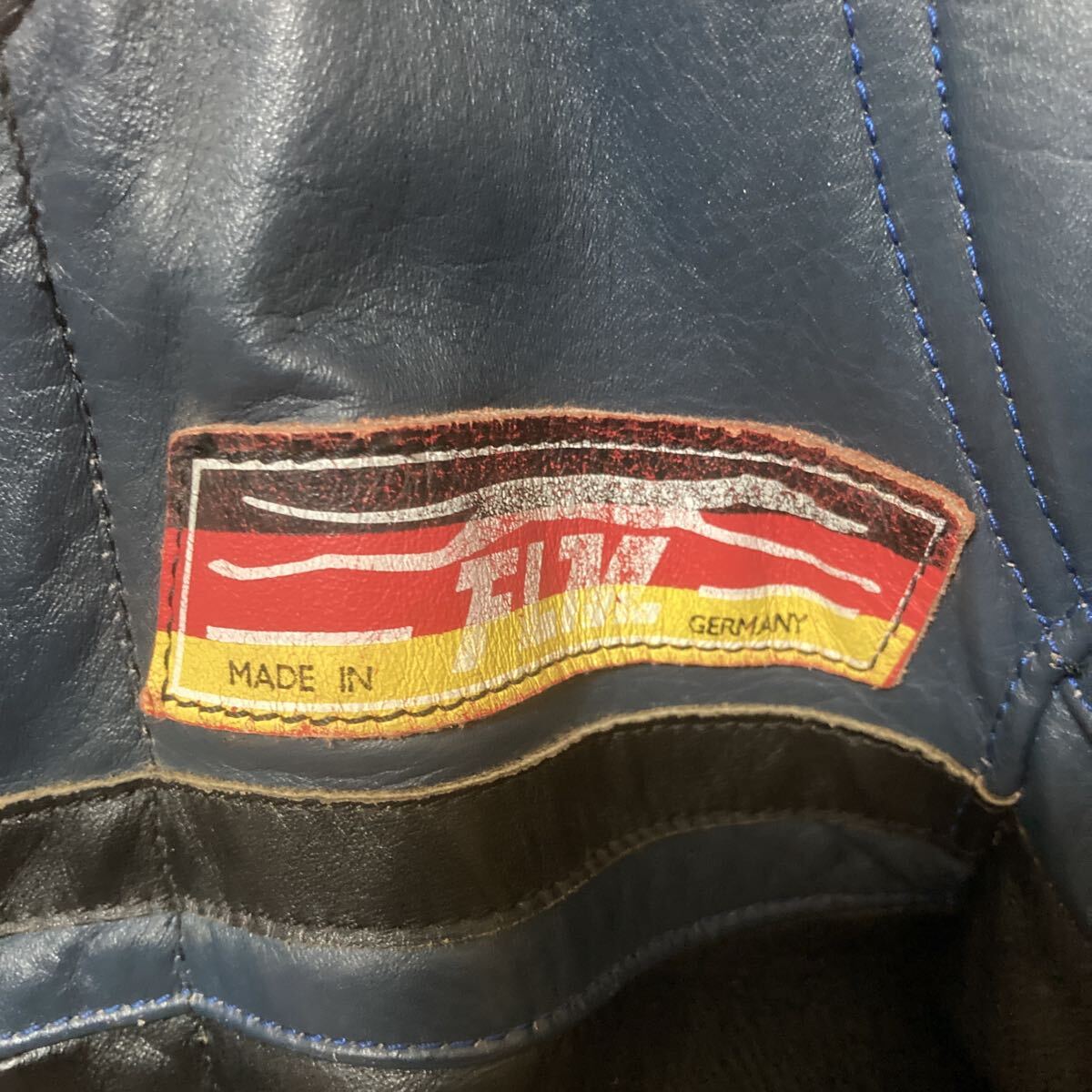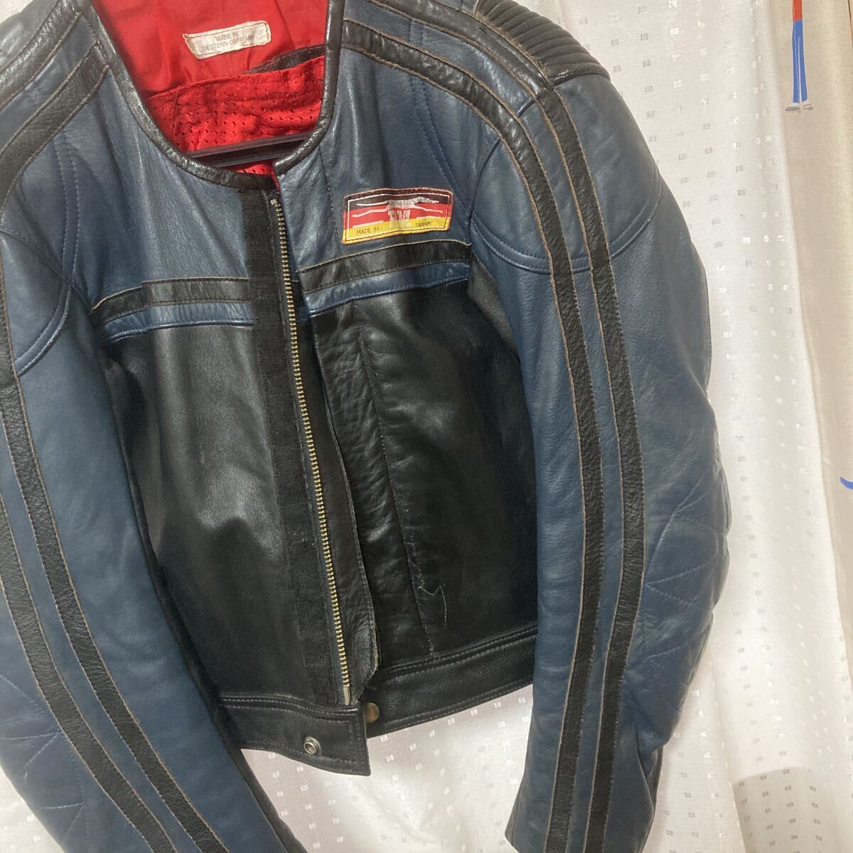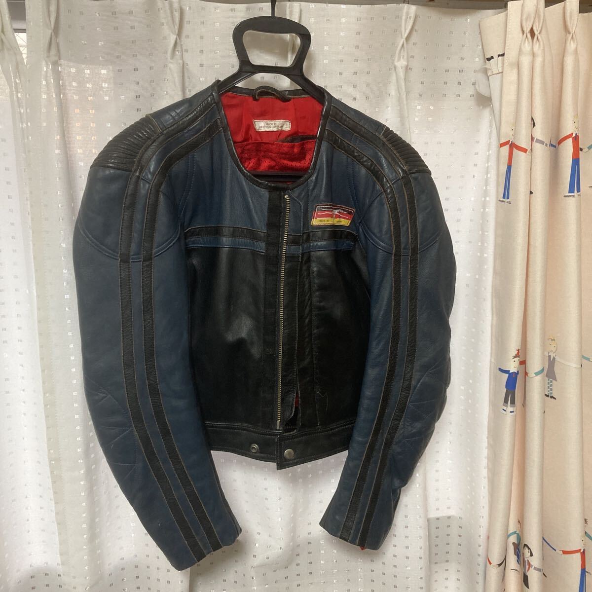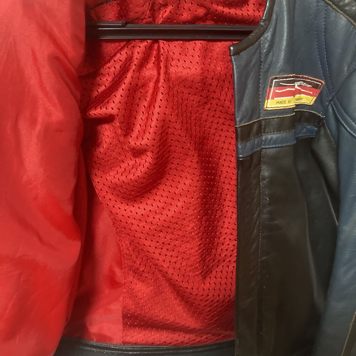 深いブルーのレザーに赤のライナーのコントラストが印象的な1着です。