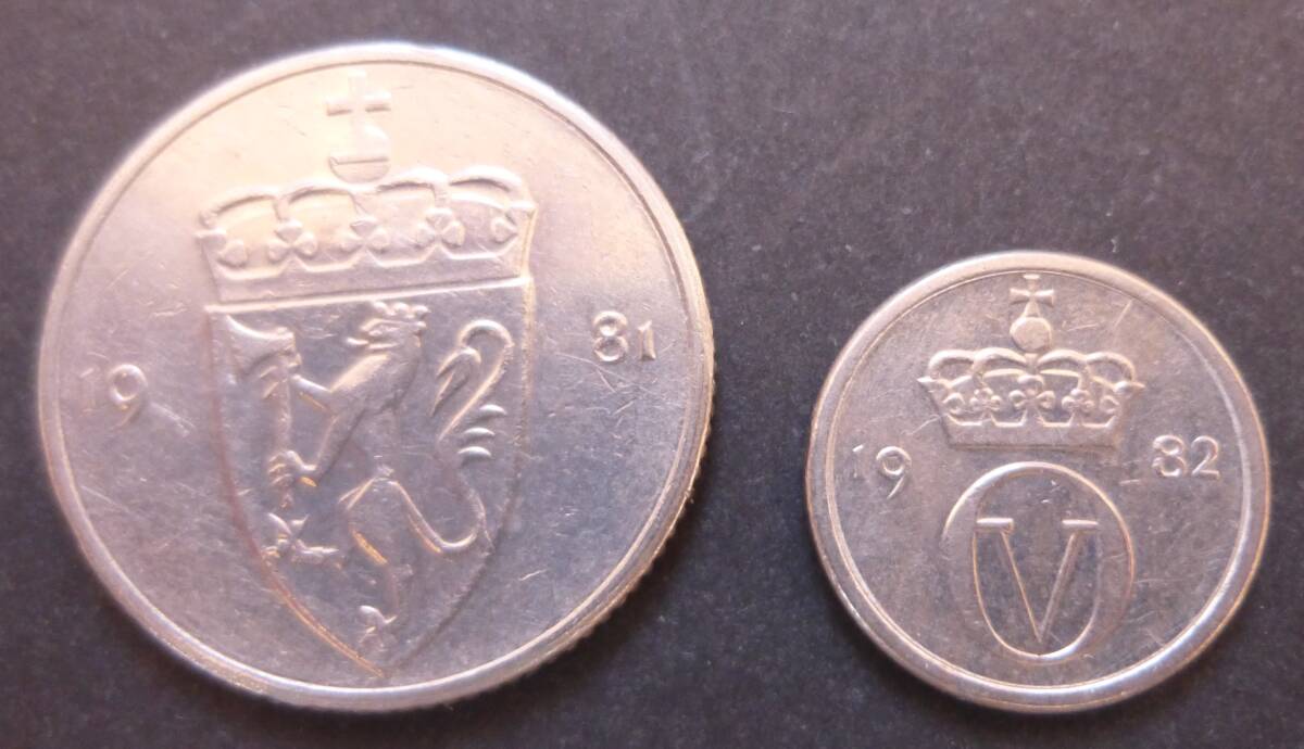 ノルウエー で発行された、10クローネ ~ 10オレ 硬貨 5種・5枚です。
