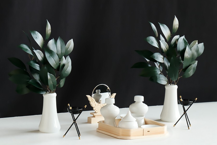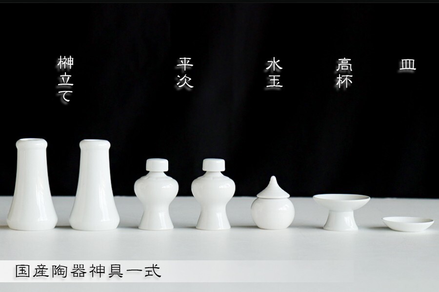 ひのき製の折敷になめらかな質感と光沢、国産「せともの」陶器製の白無地の神具セット。 お祀りに必要な神鏡、かがり火、シルク調造花榊、榊立、平次、水玉、そしてお米はお皿ではなく、ワンランク上の高杯にて神様にお供えしましょう。 小・中型(横幅65cm程度まで)の神棚に最適なサイズとなっています。 様々なセットがございます。以下から各商品ページに移行できます。 神具セット13品目高坏付一覧 | |||