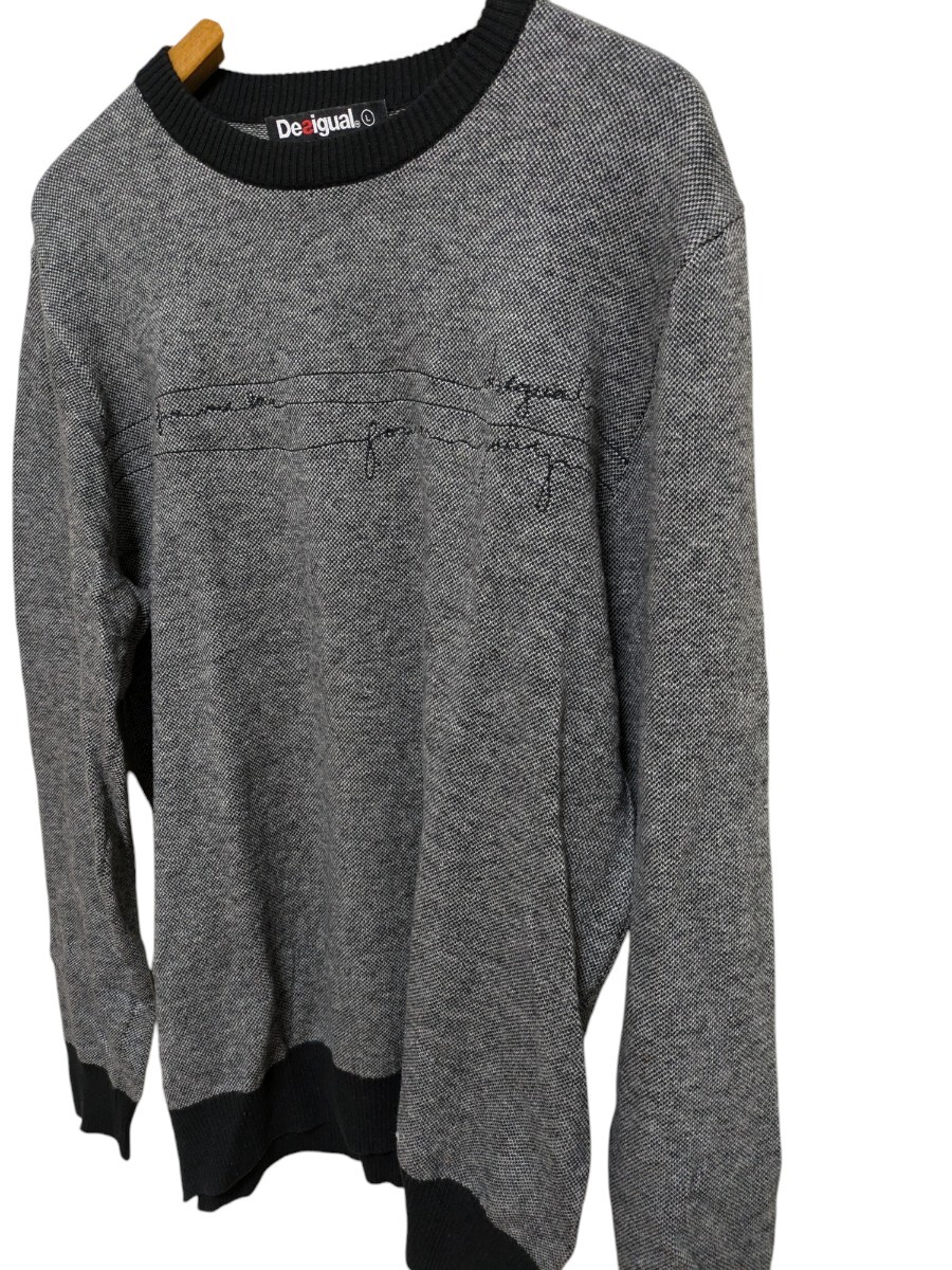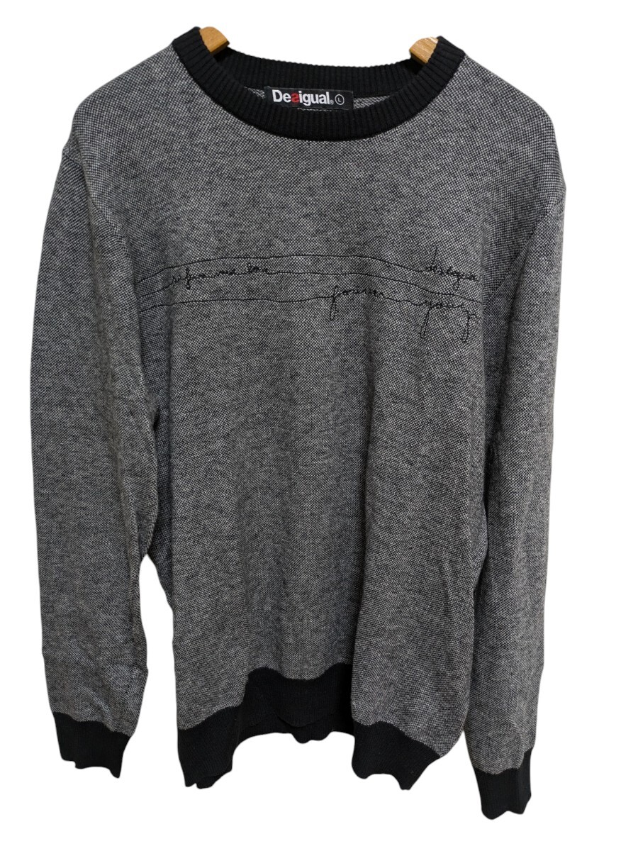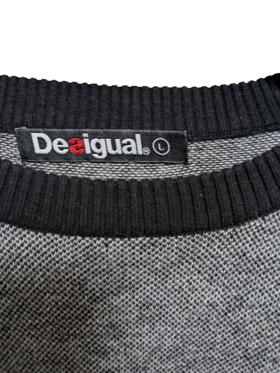 グレーのDesigual製トレーナー、Lサイズ、前面に刺繍デザイン