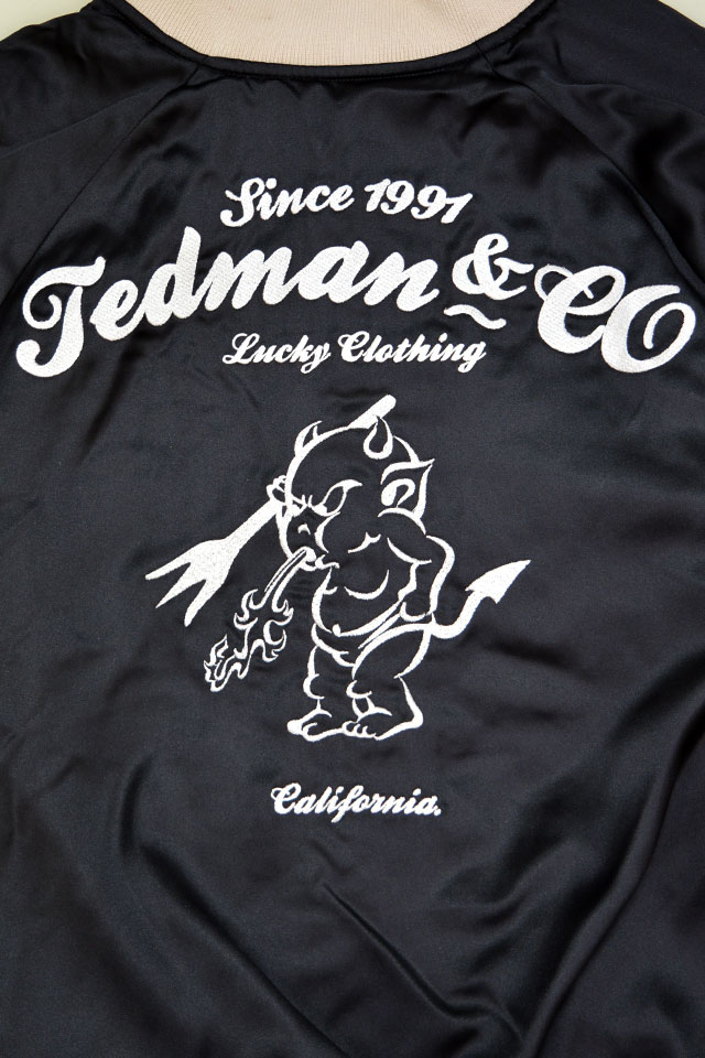 テッドマンから「龍&富士山リバーシブルスカジャン(TSK-060)」のご紹介です! テッドマンからてろんとした光沢のある生地を採用した、スカジャンが登場しました。 背中には、龍の背に乗るテッドマンの姿が描かれています。 背景には富士山を組み合わせ、和洋折衷なバックスタイルに仕上げました。 フロントにはテッドマンと龍をそれぞれ両胸に落とし込んでいます。 リバーシブル面は単色のテッドマンのみのシンプルなデザイン。 合わせるアイテムによって表裏使い分けていただくことが出来ます。 1枚持っているだけでずっと使えるスカジャン。 | ||||||||||||||||||||