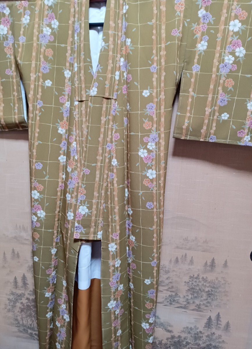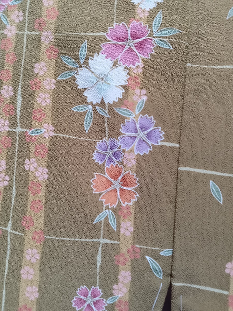 送料無料♪しつけ糸付き 未着用  明るい抹茶色の地に撫子、桜の花びらの柄 小紋着物  洗える着物