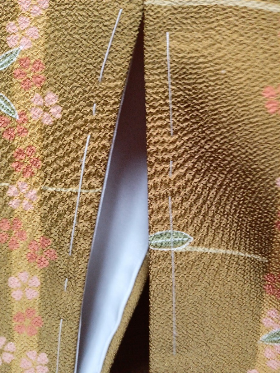 しつけ糸付き 未着用 明るい抹茶色地になでしこ、桜の花びらの柄 小紋着物