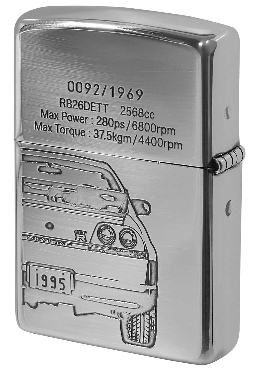 世界に誇る日本の名車「日産スカイラインGT-R」のZIPPOライター。日産自動車のオフィシャルライセンス製品で、歴代のスカイラインGT-Rの意匠と諸元を忠実に再現。表面には歴代のスカイラインGT-Rのロゴに、車体フロントビュー、登場年と型式。裏面には4灯の特徴的なテールランプを含むリアビュー、エンジン型式、最高出力、最大トルクのスペックを記載。さらに、初代スカイラインGT-Rが登場した1969年にちなみ、1969個の限定生産を表すシリアルナンバーが記載されたスペシャルなZIPPOです。