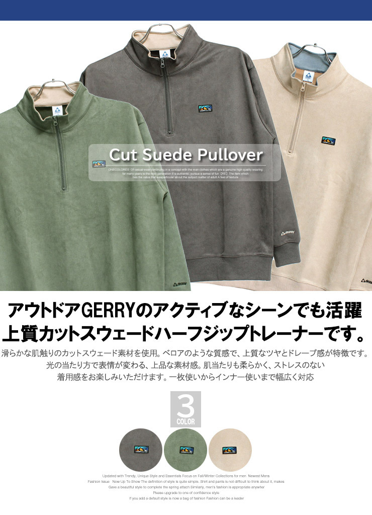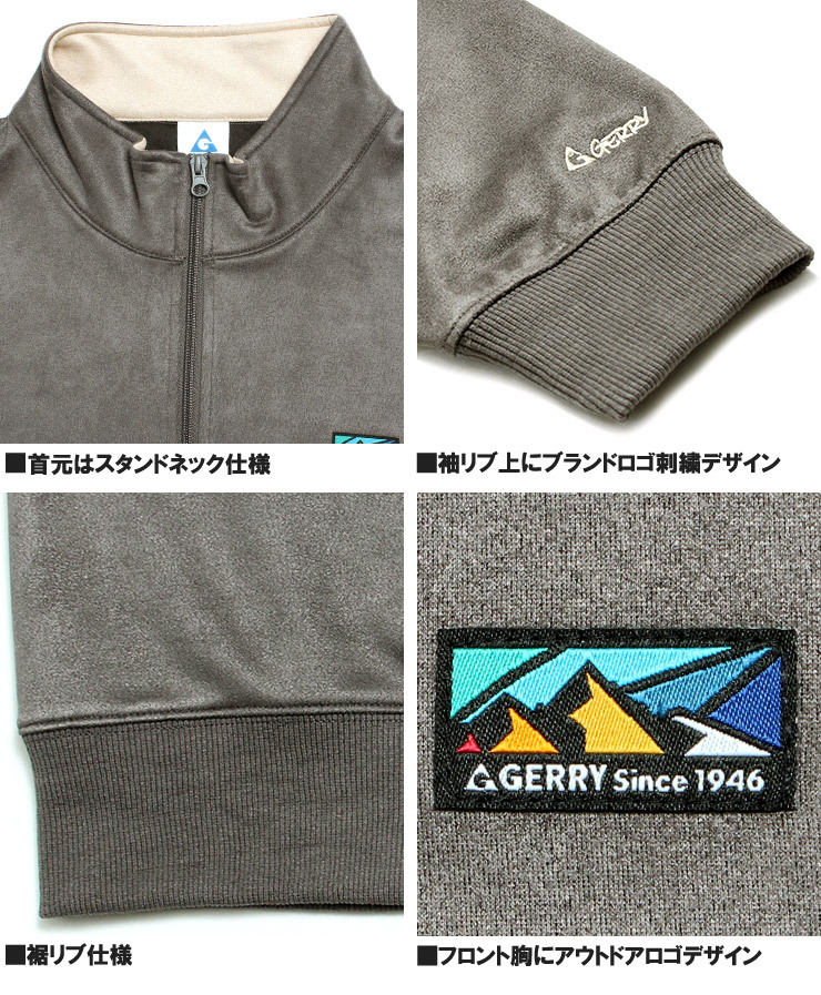 商品説明 | アウトドアブランドGERRYのアクティブなシーンでも活躍してくれる上質なカットスウェードを使用したロゴプリントハーフジップスウェットトレーナーの登場です。 |