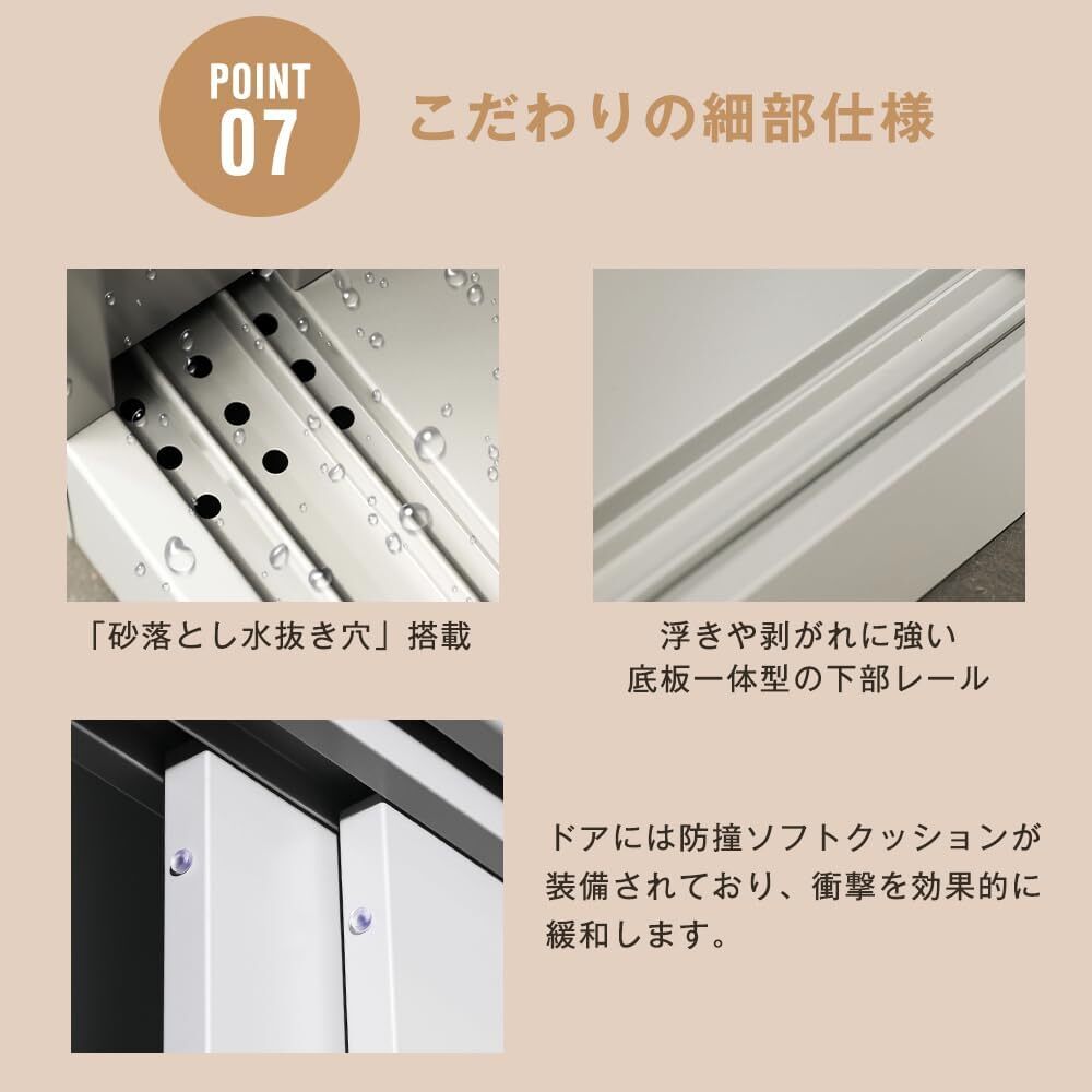 • 【こだわりの細部仕様】「砂落とし水抜き穴」搭載 浮きや剥がれに強い底板一体型の下部レール ドアには防撞ソフトクッションが装備されており、衝撃を効果的に緩和します。
