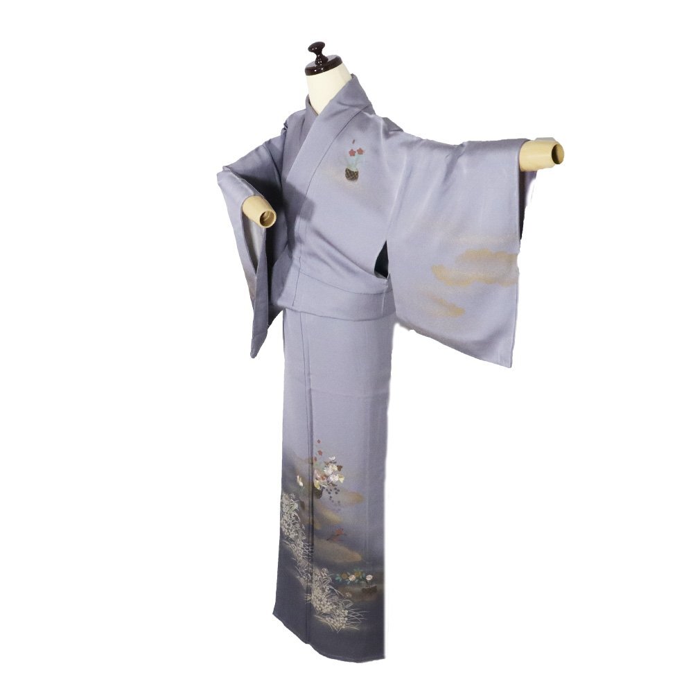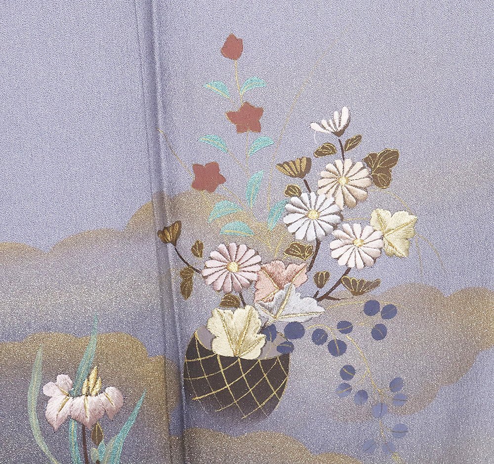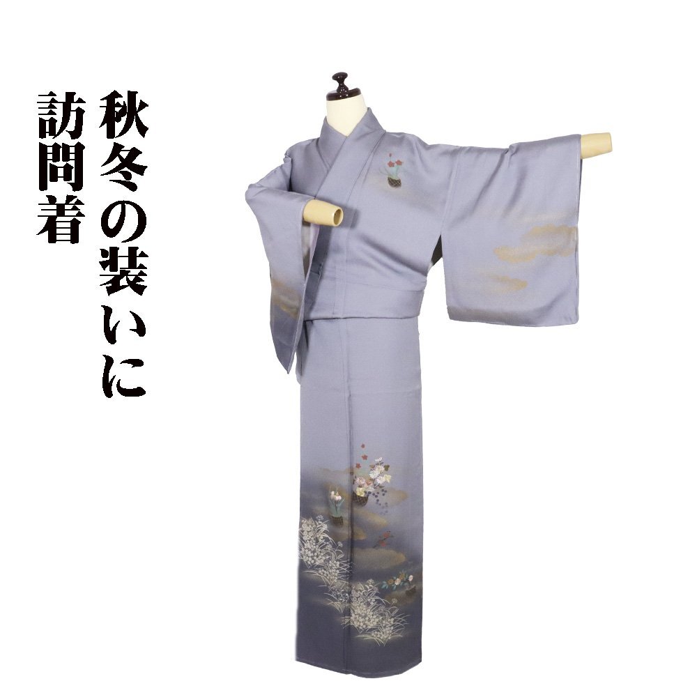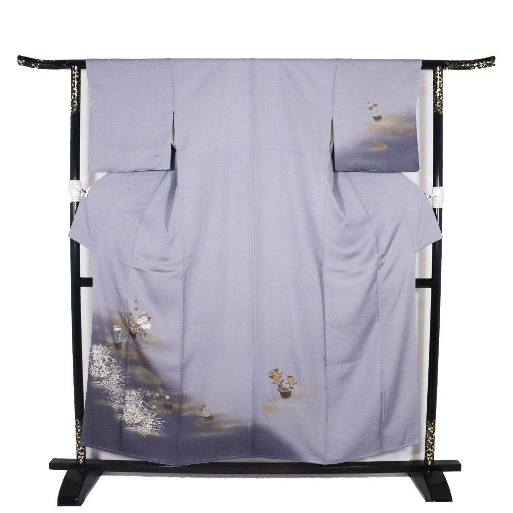 | 訪問着 袷 丹後縮緬地 グレー紫(鳩羽色)・紫(濃鼠色)暈し地 刺繍・菊・菖蒲・花篭 金箔・草花・雲 160 広襟 仕付け付き |