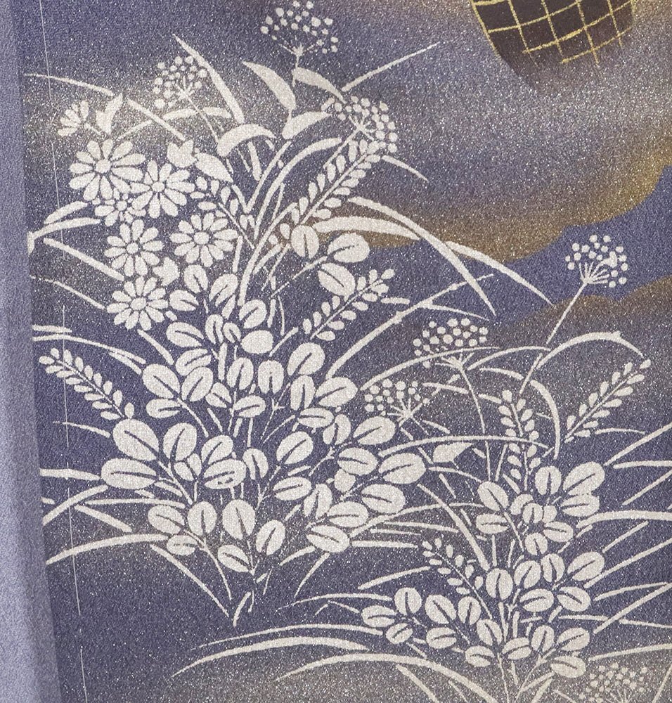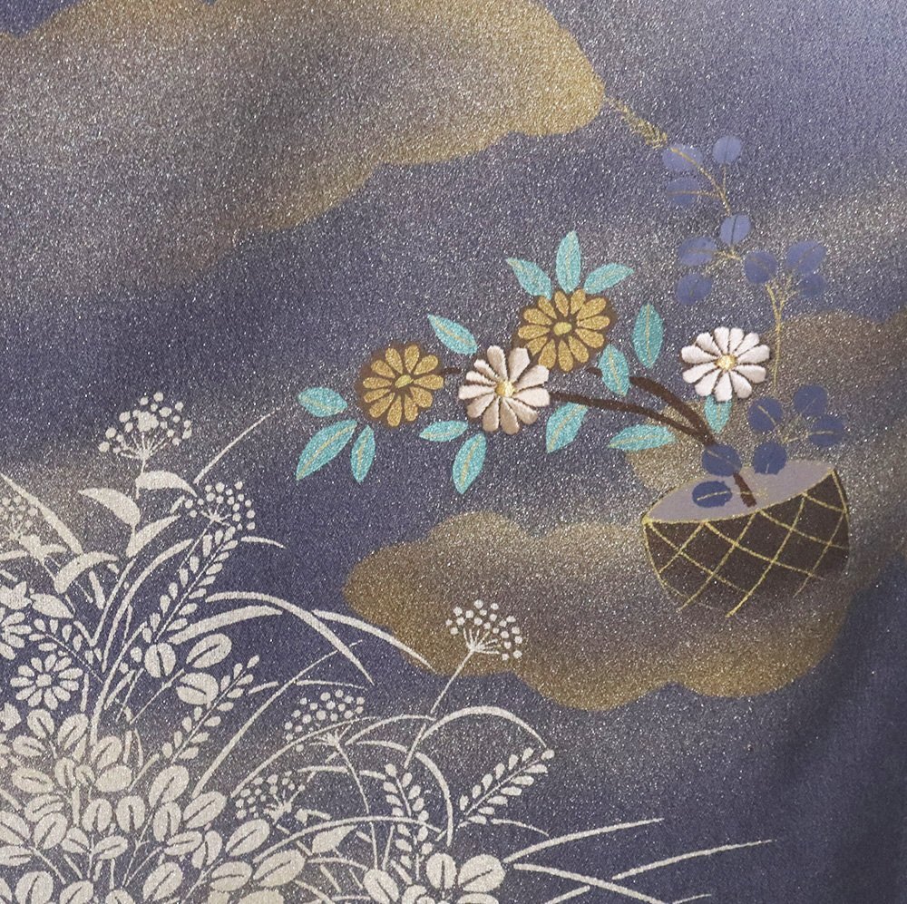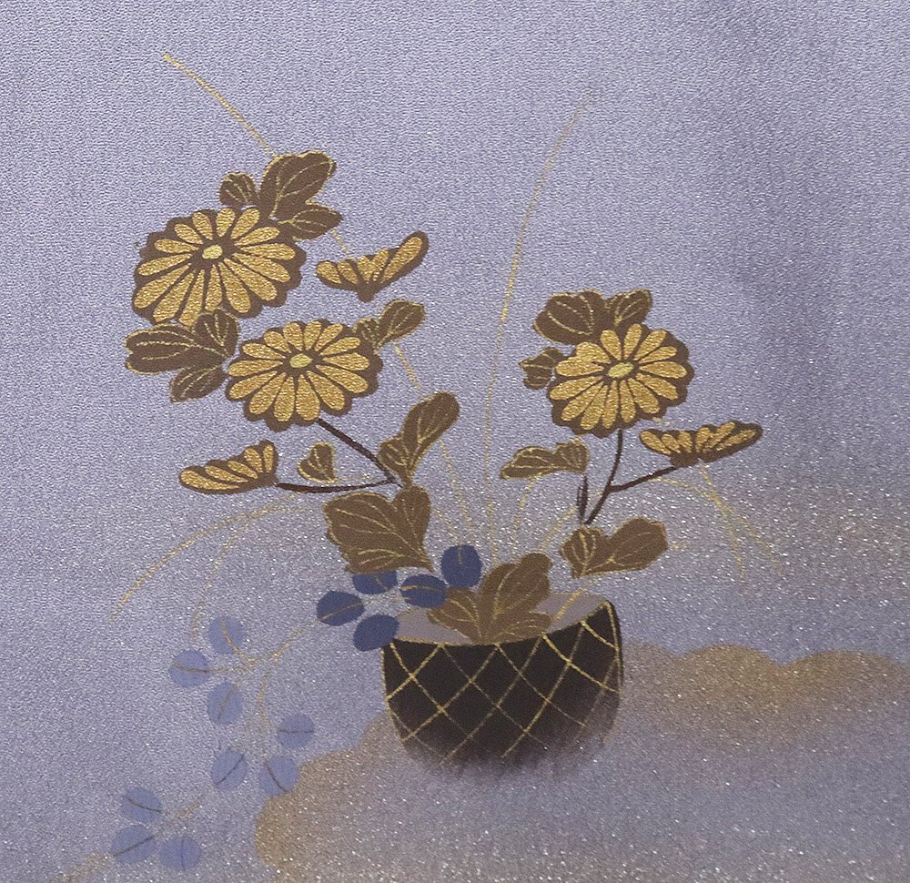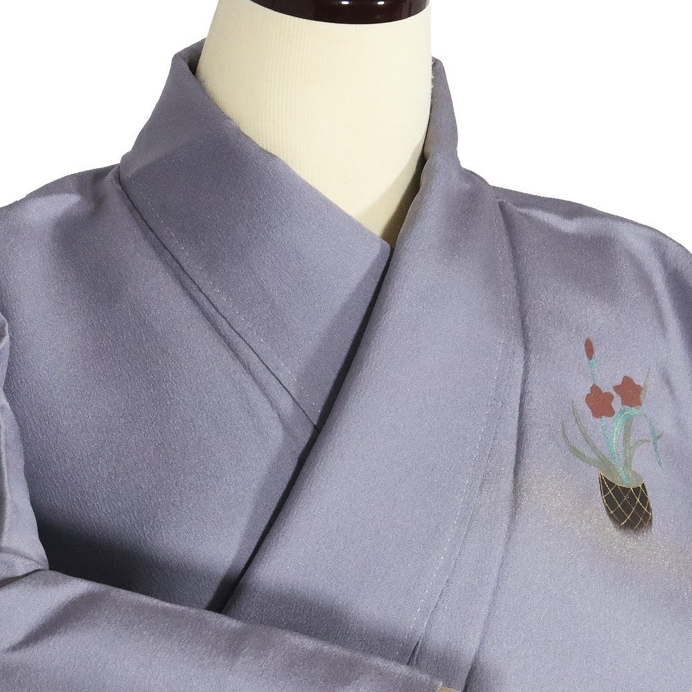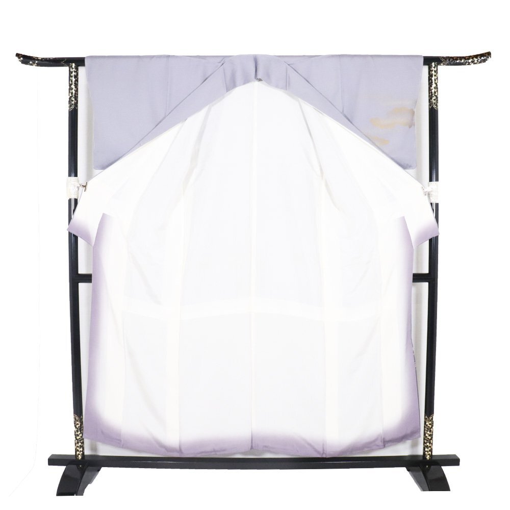 | 訪問着 袷 丹後縮緬地 グレー紫(鳩羽色)・紫(濃鼠色)暈し地 刺繍・菊・菖蒲・花篭 金箔・草花・雲 160 広襟 仕付け付き |