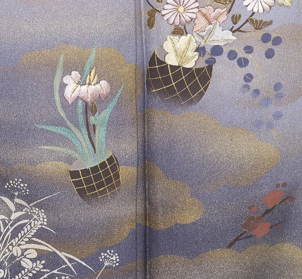 訪問着 袷 丹後縮緬地 グレー紫(鳩羽色)・紫(濃鼠色)暈し地 刺繍・菊・菖蒲・花篭 金箔・草花・雲 (写真では上手く色が出ない場合があります。ご了承下さい) |