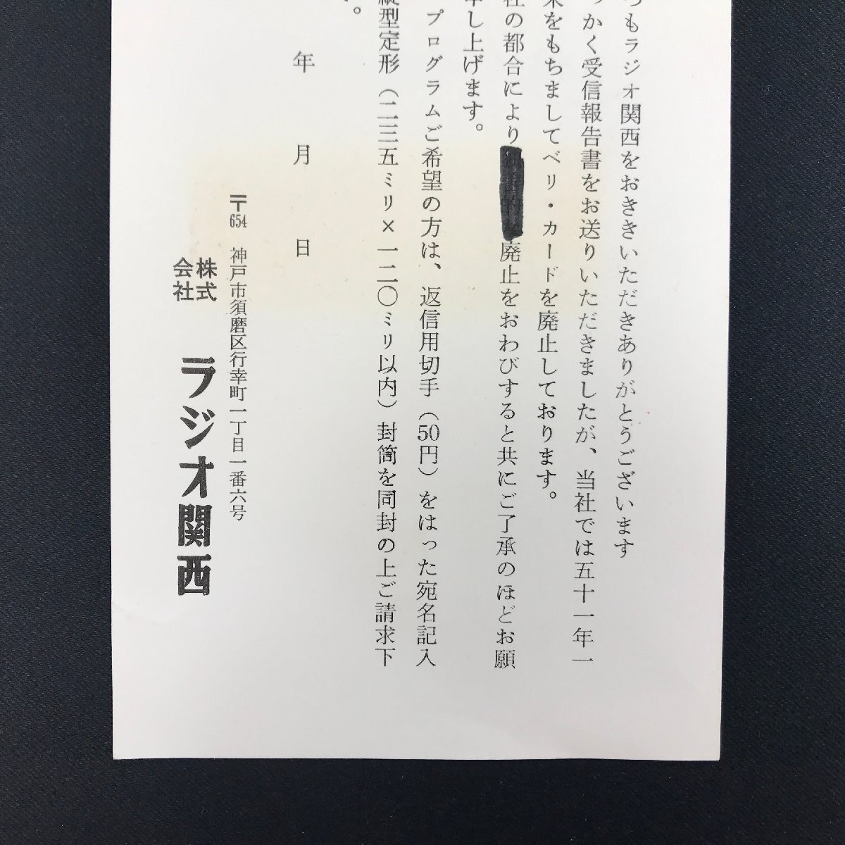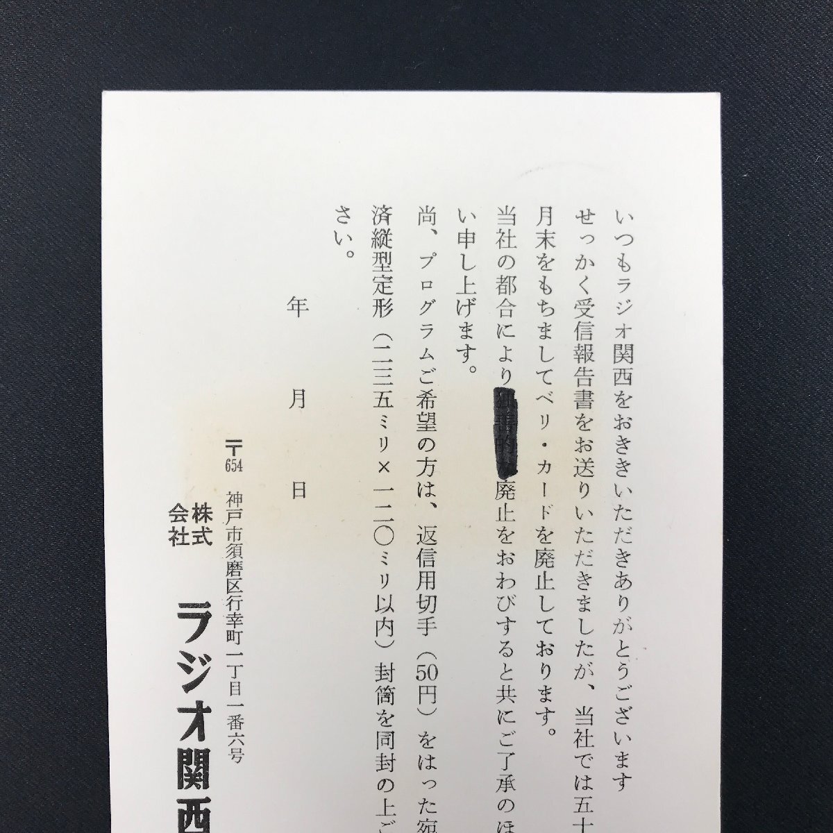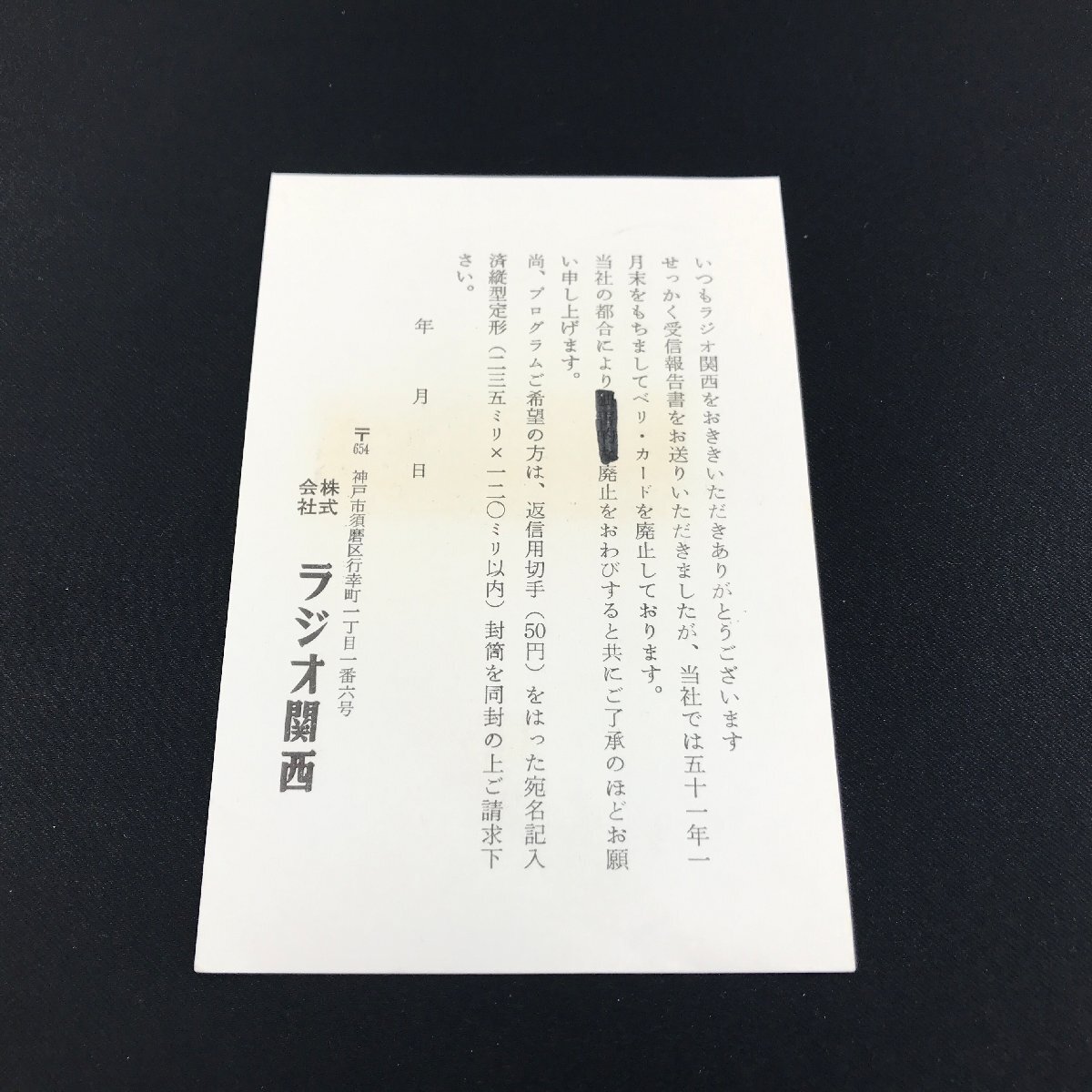 | ■商品名:ベリカード廃止通知 ■放送局:ラジオ関西 ■放送国:日本 ■年代:1970年代 ※出品商品は画像に写るものが全てとなります。 ※ハンガーやスタンド等、当店の備品を用いて撮影を行う場合がございますが、備品は付属いたしません。 | ||