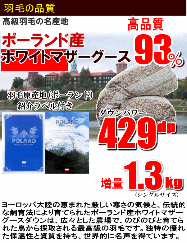 ■中身:ポーランド産ホワイトマザーグースダウン93% フェザー7%