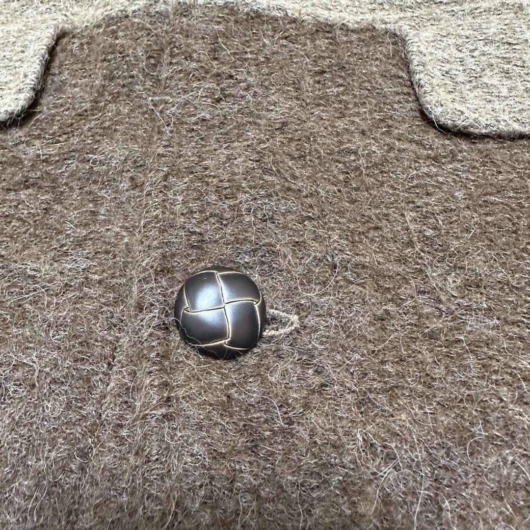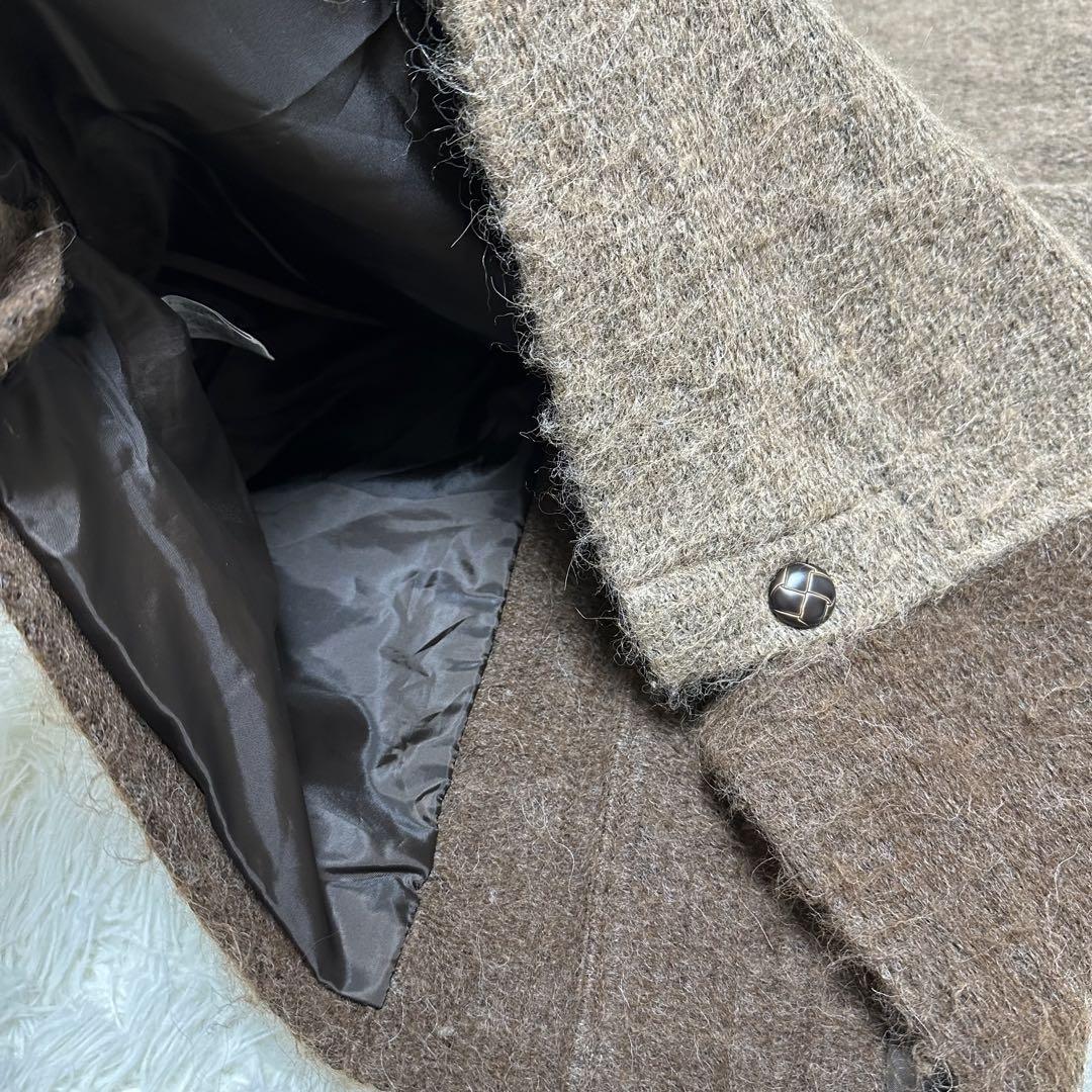 ウール系の生地を使用したこのジャケットは、ベージュとブラウンのツートンカラーが特徴です。カジュアルなスタイルで、普段使いに最適です。