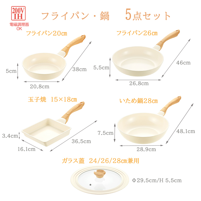 オール熱源対応の20cm・26cmフライパンと28cm炒め鍋、15×18cm玉子焼と兼用ガラス蓋のセット。