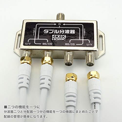 「ホーリック アンテナダブル分波器 【4K8K放送(3224MHz)/BS/CS/地デジ/CATV 対応】 ケーブル4本付属 1m HAT-WSP」▼4533115023283▼(商品説明)W分波器ケーブル付き・ホワイト 1m(ネジ式) HAT-WSP010・・Size:1m(ネジ式)・【本体仕様】 ●入力周波数:10~3224 MHz ●U/V出力周波数:10~770 MHz ●BS/CS出力周波数:1000~3224 MHz ●サイズ:W約99.5 x H約65.0 x D約16.8 mm・【ケーブル仕様】 ●ケーブル規格:S-4C-FB ●ケーブル直径:6mm ●ケーブル長:1m・●コネクタ規格:F型 ●コネクタ形状:両側ネジ式(金メッキ仕様) ●コネクタサイズ:W約12.5 x H約12.5 x D約32.75 mm ●インピーダンス:75Ω・袋パッケージ・●期間:1年間 ●生産国:中国説明 ■分波器と分配器の機能が1つに 信号の分配と分波が本機1つで可能になり、テレビとレコーダーなどへの接続が無駄なくすっきりと行えます。 ■アンテナ信号を効率よく分配 アンテナコンセントが1つしかない場所でも2台の機器へアンテナ信号を送ることが可能です。 ■地デジ信号とBS/CS信号へ分波 混合されている地デジ信号とBS/CS信号を分けて、テレビとレコーダーなどの2台の機器へそれぞれ接続できます。 ■新4K8K衛星放送対応 従来の地デジ、BS、110度CS放送に加えて、最新の4K8K放送にも対応しています。 ■ノイズに強いメタルケース ■BSアンテナ電源供給可能 ■取り外し可能なS-4C-FB同軸ケーブル4本付き 【使用上の注意】 ご使用には入力用のアンテナケーブル(別売)が必要です。