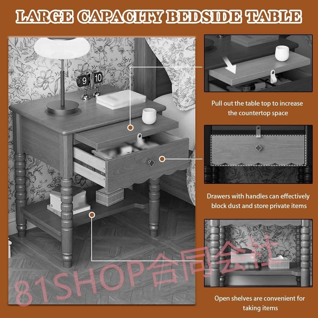 【大容量のベッドサイドテーブル】:サイドテーブルは十分な収納スペースを提供します。テーブルトップを引き出してカウンタートップのスペースを増やします。ハンドル付きの引き出しはほこりを効果的に防ぎ、プライベートアイテムを保管できます。オープンシェルフはアイテムを取り出すのに便利です。