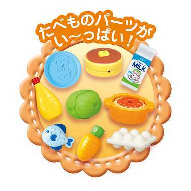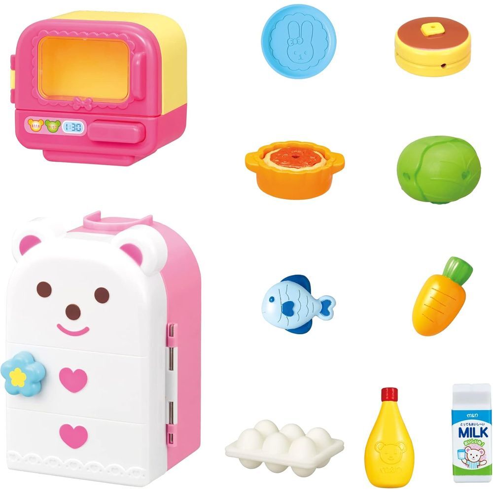 セット内容:レンジ、れいぞうこ、お皿、たべものパーツ8個(キャベツ、にんじん、さかな、たまご、牛乳、マヨネーズ、ミートドリア、ホットケーキ)