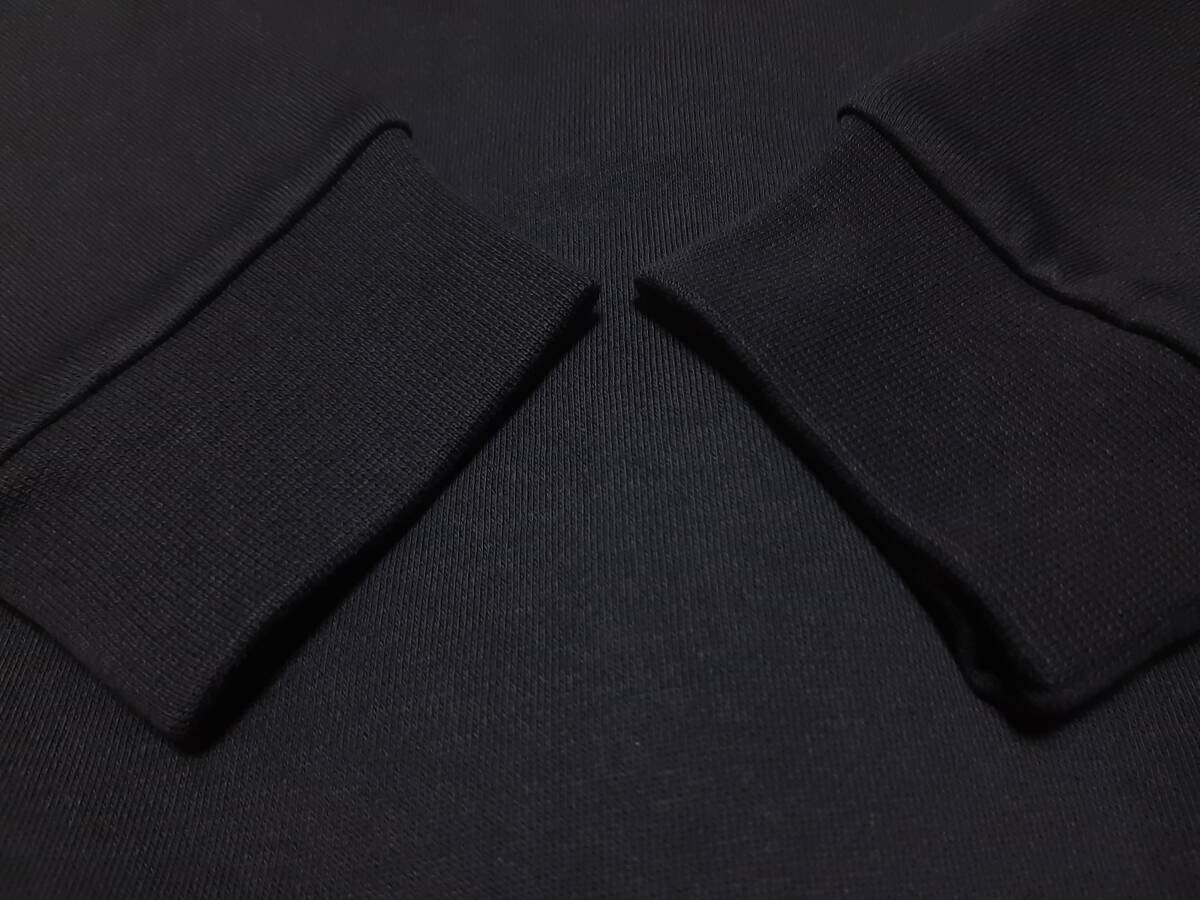全体の色は『黒』となり、胸にはラバー素材のロゴが施されています。生地は、『綿』メインによる『スウェット素材』が採用され、『裏起毛』になってることから保温性に優れています。秋冬に向いた素材感なので、暖かく過ごすことのできるアイテムだと思います。
