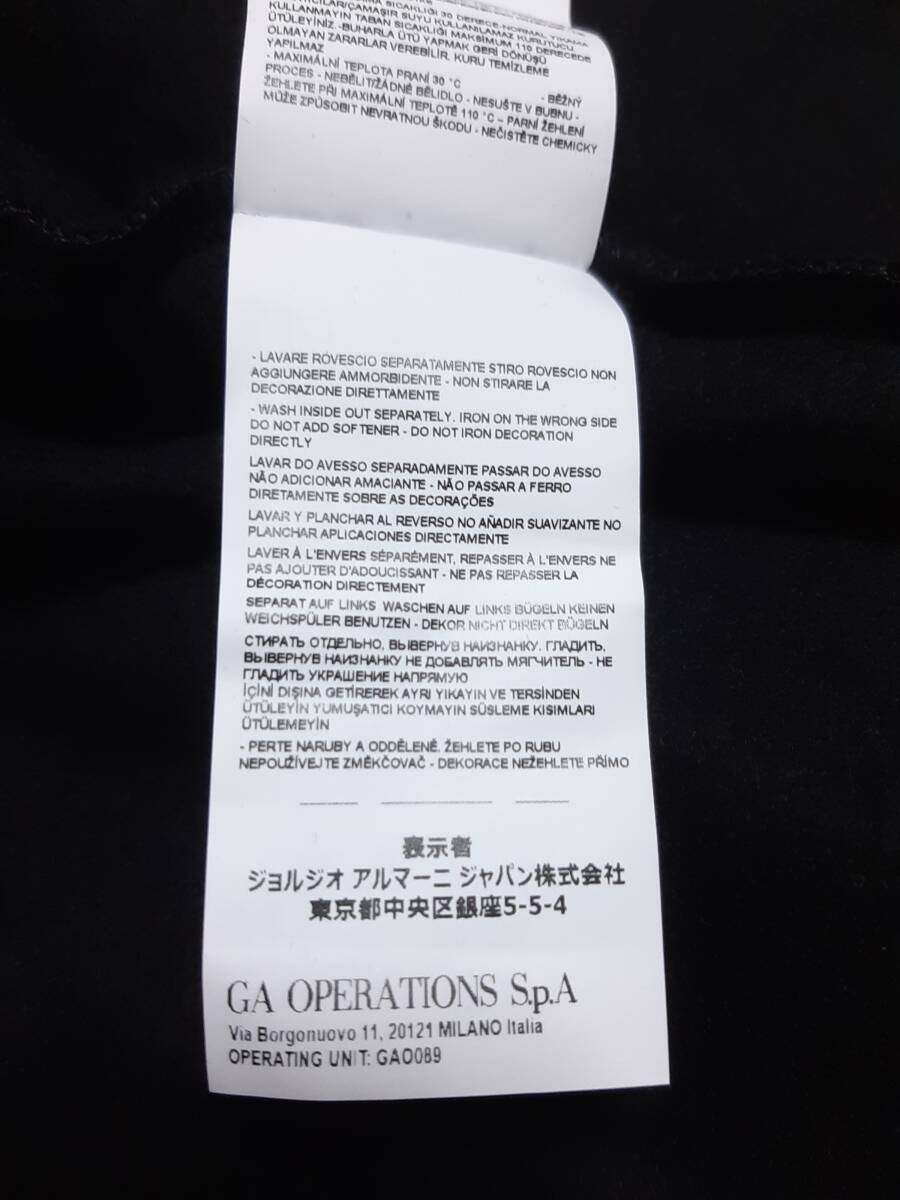 現在は並行輸入品でも、服の内部に付いた品質表示のタグには日本語で、【表示者 ジョルジオ アルマーニ ジャパン株式会社】と記されていることを理解しておいてください。また、輸入元の海外は日本ほど商品の扱いが丁寧ではありません。生地に若干のスレなどがある場合があり、目立つものは記しますが、目立たないものに関しては記しませんので、完璧な商品をお求めな方は正規店をご利用ください。