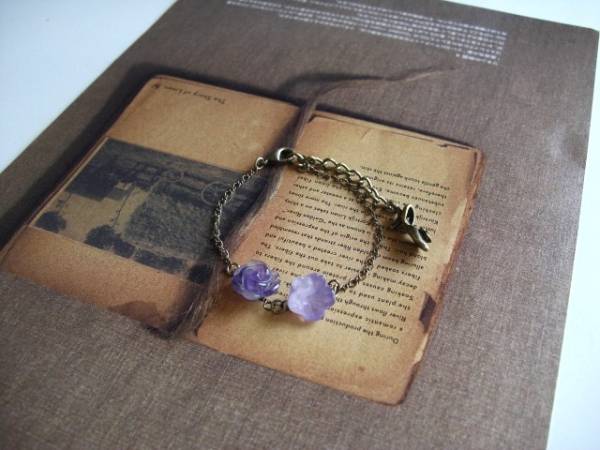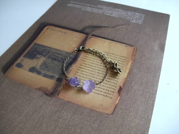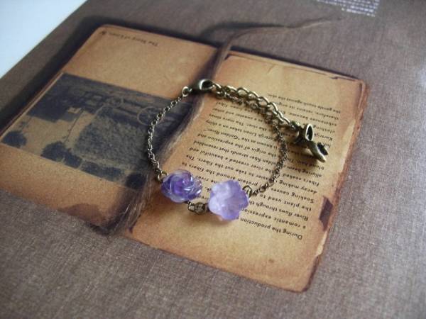 可愛さのスパイス・・シリーズです♪アメジスト・マニア・・神秘的なアメジストのブレスレットです♪繊細なパープルのグラデーションのお色のお花や薔薇を集めて可憐な表情です♪華奢なチェーンには12~13ミリ位のアメジストのお花や薔薇を散らしてロマンチックしています♪長さは16センチ+アジャスター6センチで最長22センチ位です♪お揃いのネックレスも出品しています♪シンプルで飽きのこないいつまでも着けられるデザインを考えて作りました!ハンドメイドをご理解頂いてノークレーム、ノーリターンでお願いします
