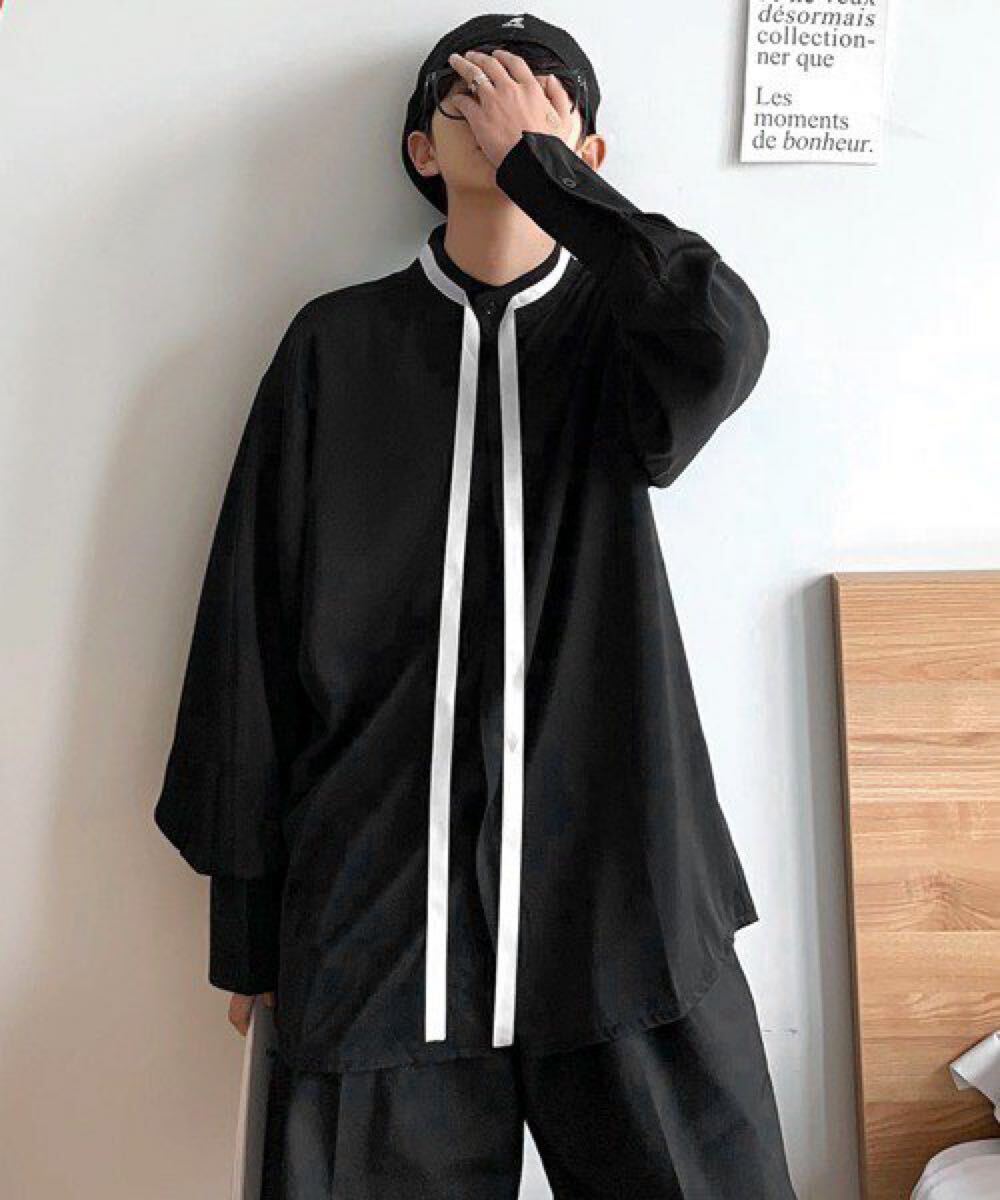 ■トレンド感のあるビッグシルエットでイマドキな「ルーズシルエット リボン タイ付きバンドカラー ノーカラー ロングスリーブ シャツ」