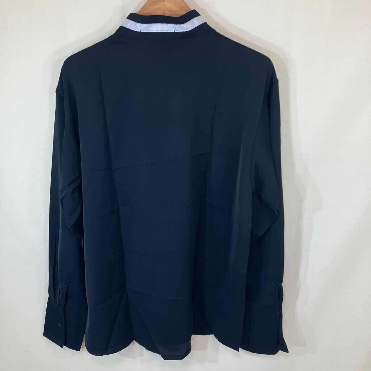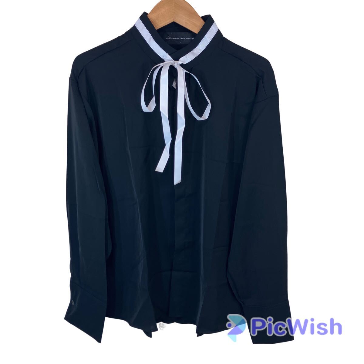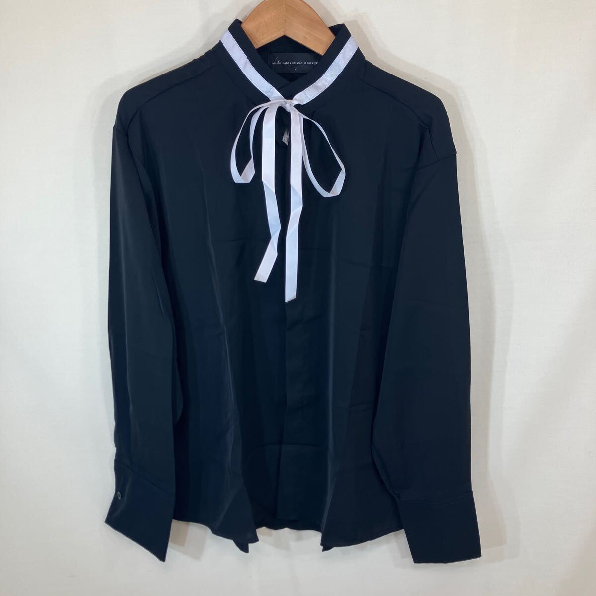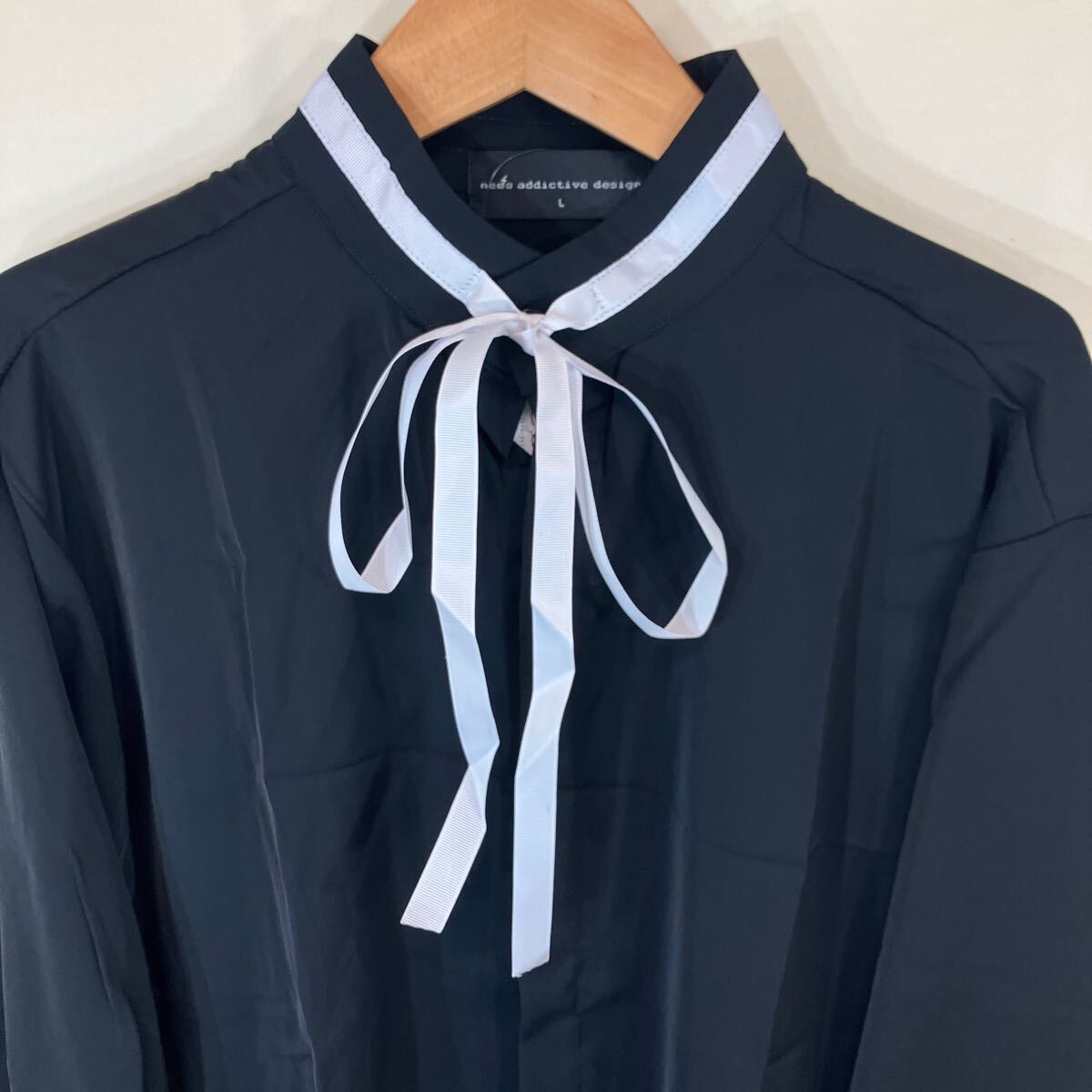 【neos -addictive design-】ルーズシルエット リボン タイ付きバンドカラー ノーカラー ロングスリーブ シャツ