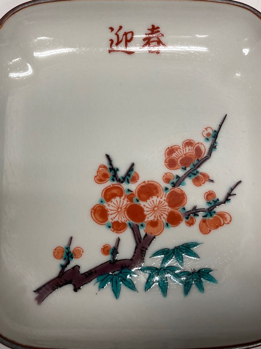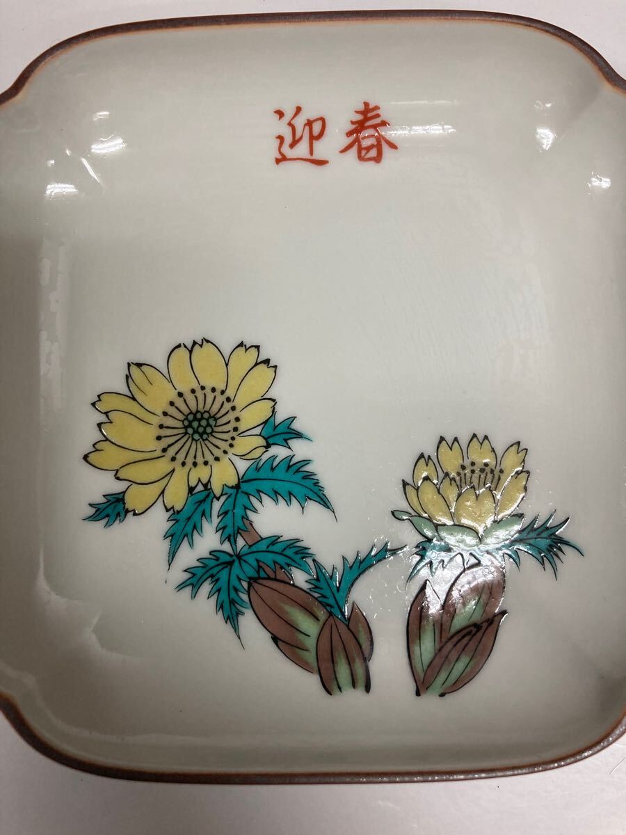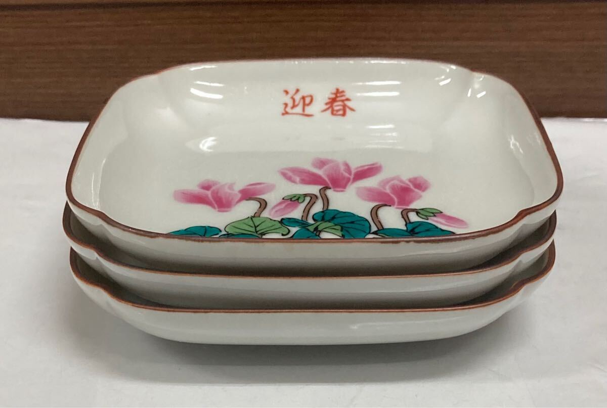 九谷 湯山 ♪ 皿 3枚セット 揃 角皿 銘々皿 取り皿 小皿 花柄 迎春
