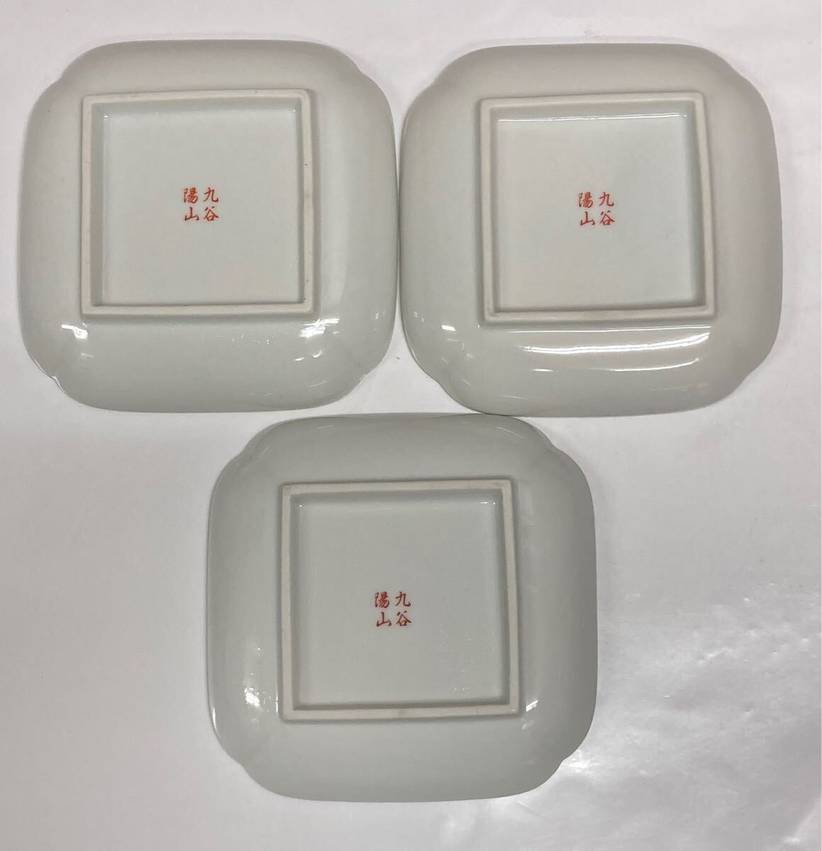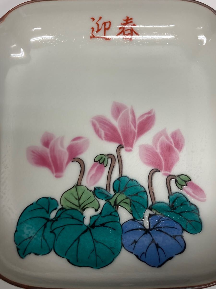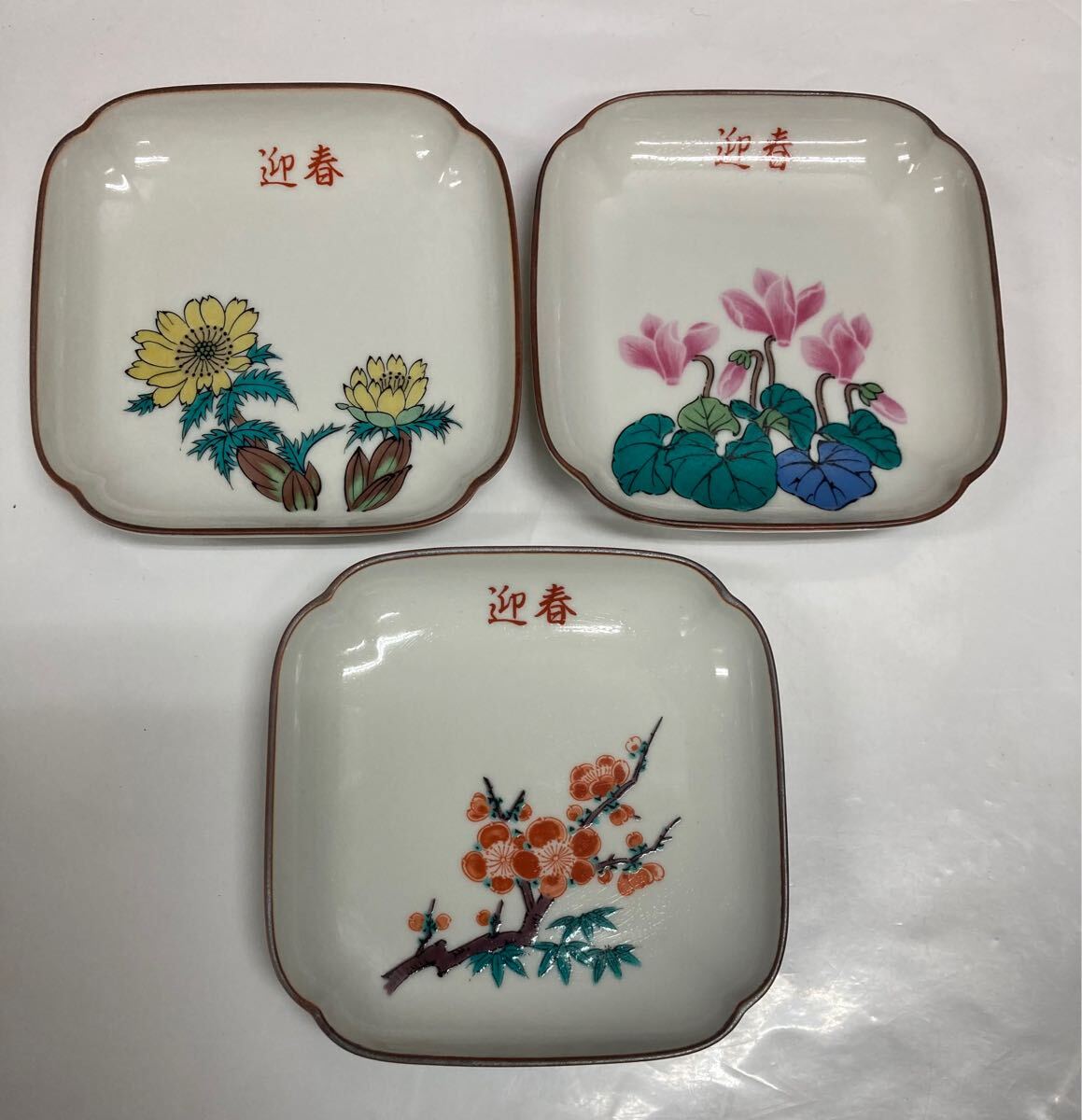 九谷 湯山 ♪ 皿 3枚セット 揃 角皿 銘々皿 取り皿 小皿 花柄 迎春