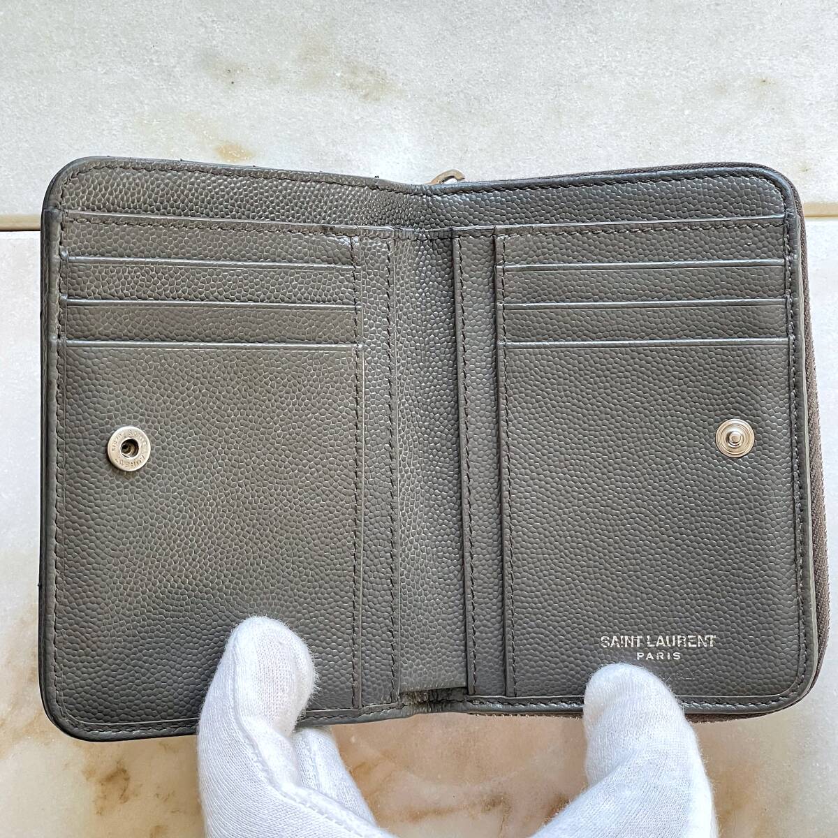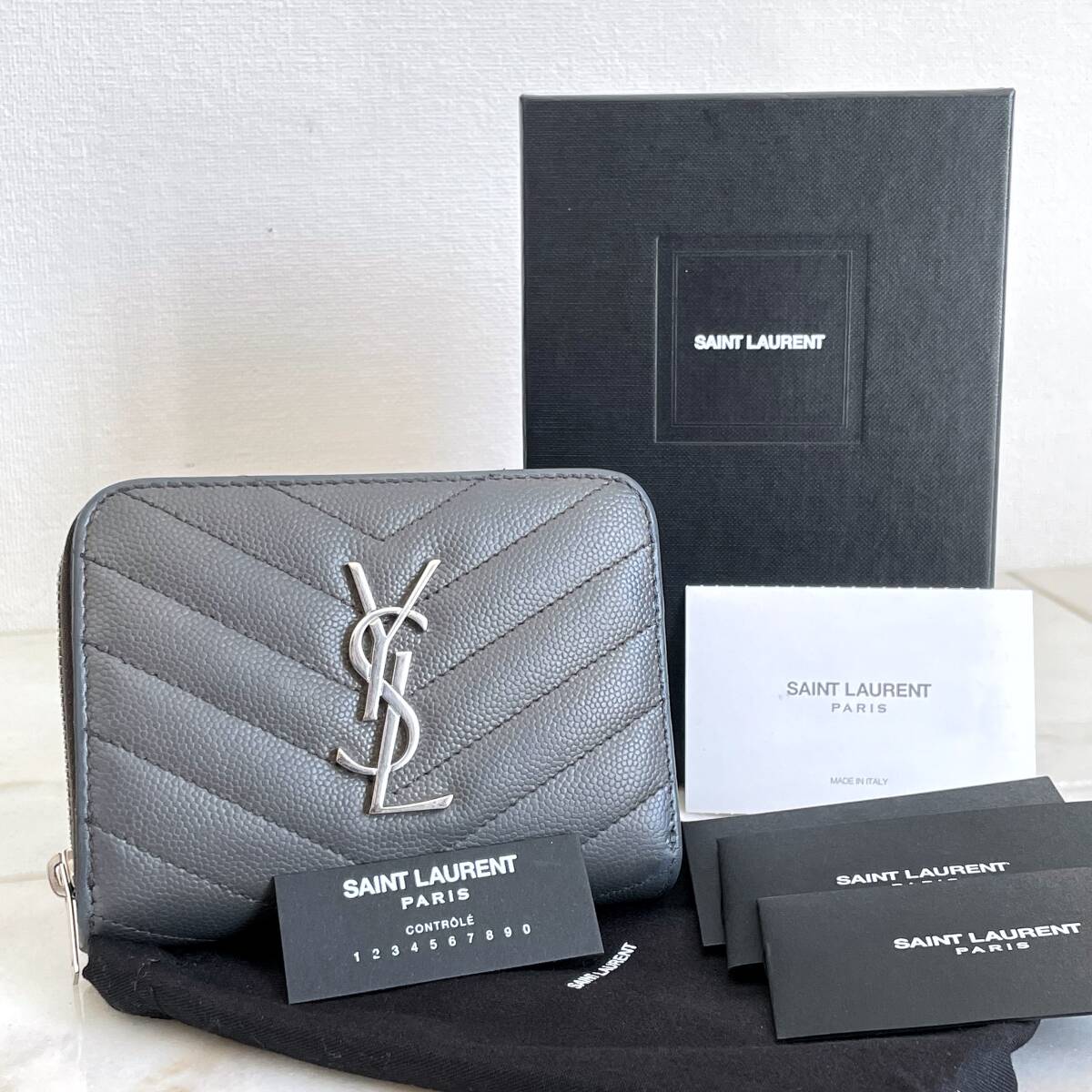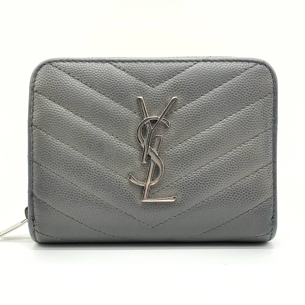 Yves Saint Laurent イブサンローラン / カサンドラ 二つ折り コンパクト財布 / グレー / レザー 本革 / YSL シルバー金具 イタリア製 正規品
