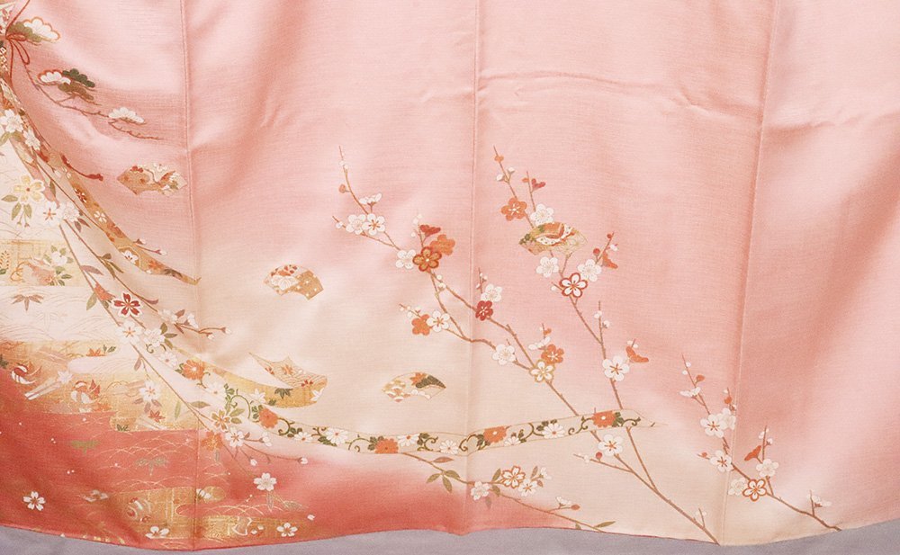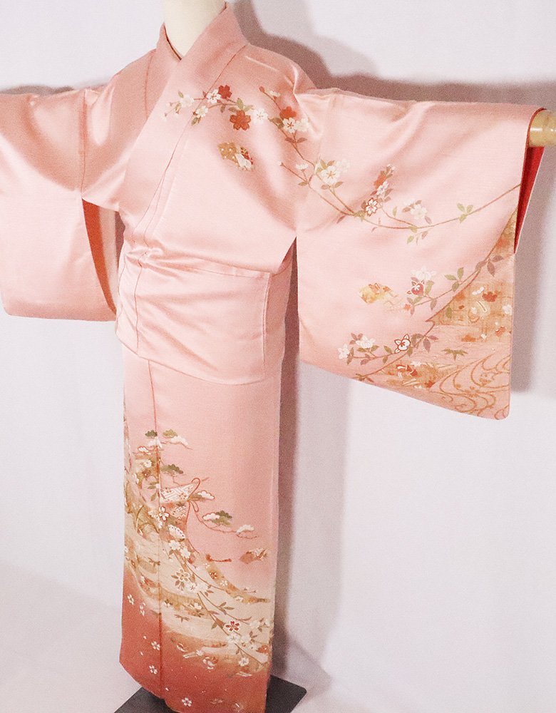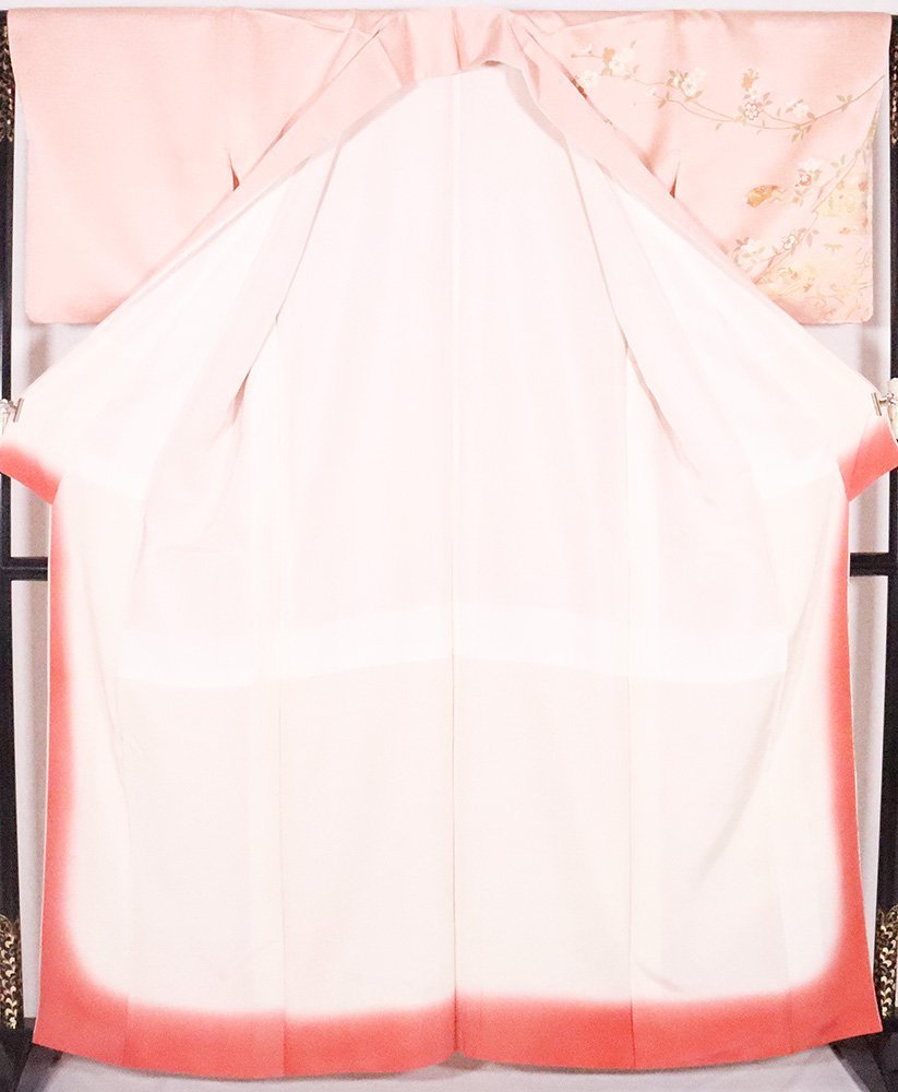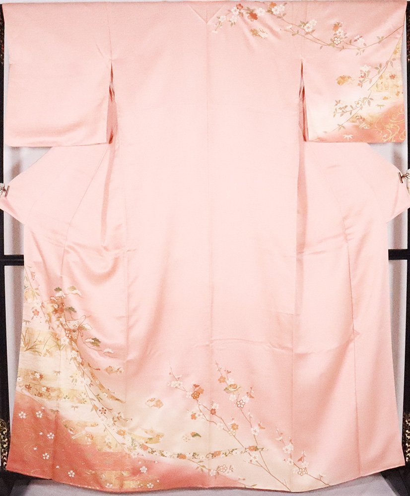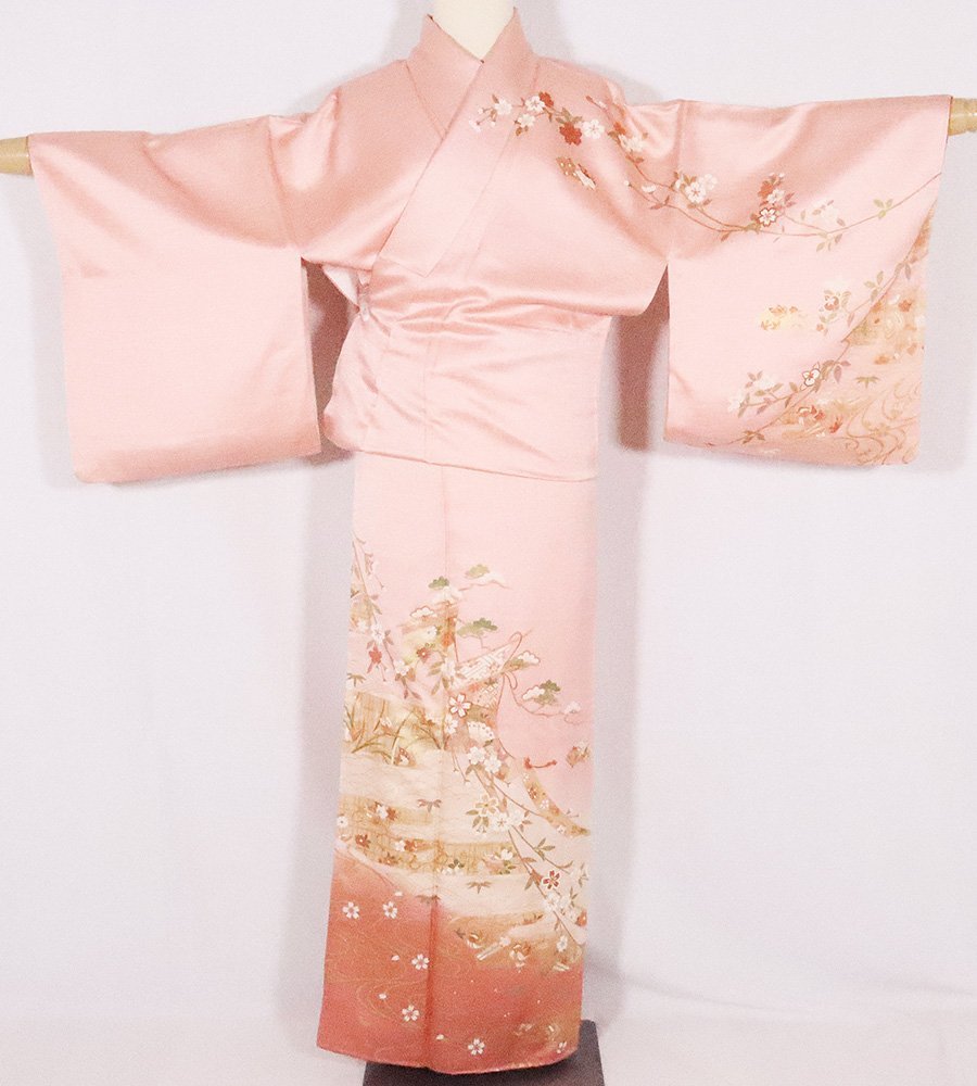 | 訪問着 袷 丹後縮緬地 薄赤紫暈し地小縞綸子地 枝垂れ桜・松竹梅・オシドリ・宝尽くし・几帳文 169 広襟 | |