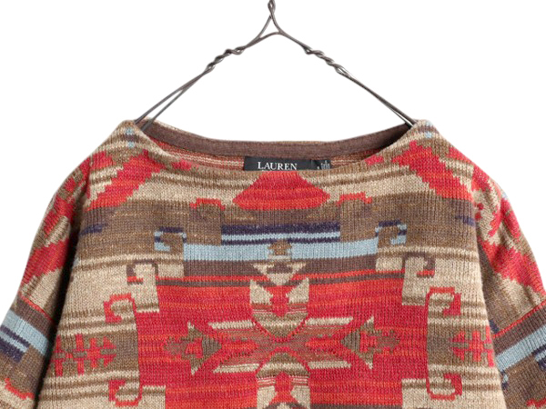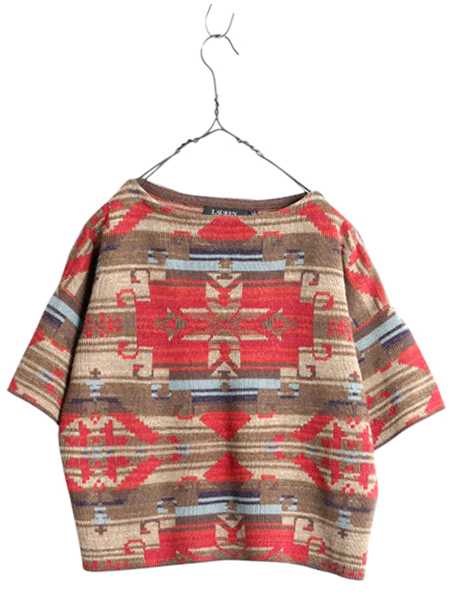 | 商品名 | LAUREN ラルフローレン ボートネック ネイティブ柄 半袖 ニット セーター レディース M 古着 ポロ コットン リネン 総柄 重ね着 ショート丈 |