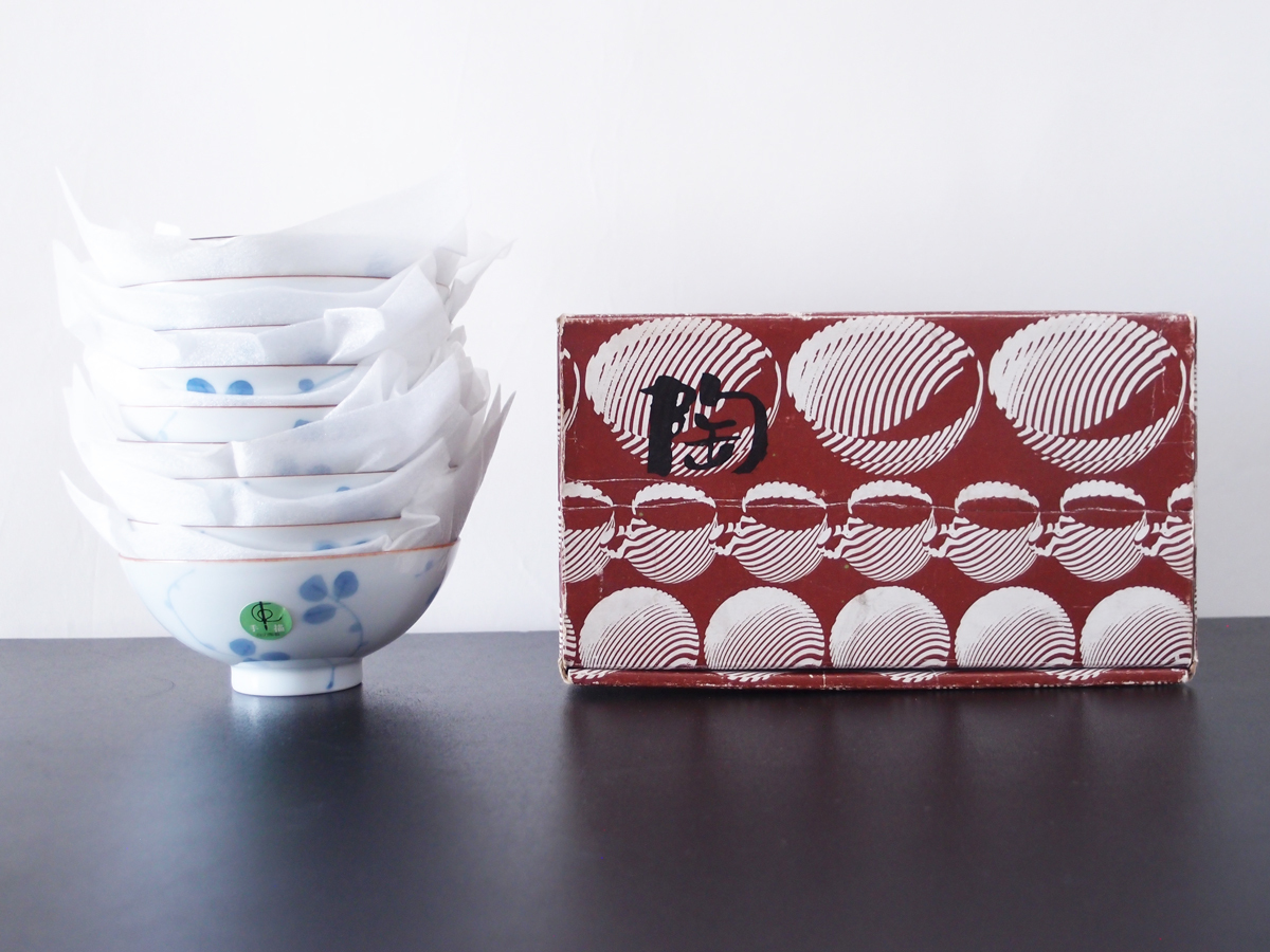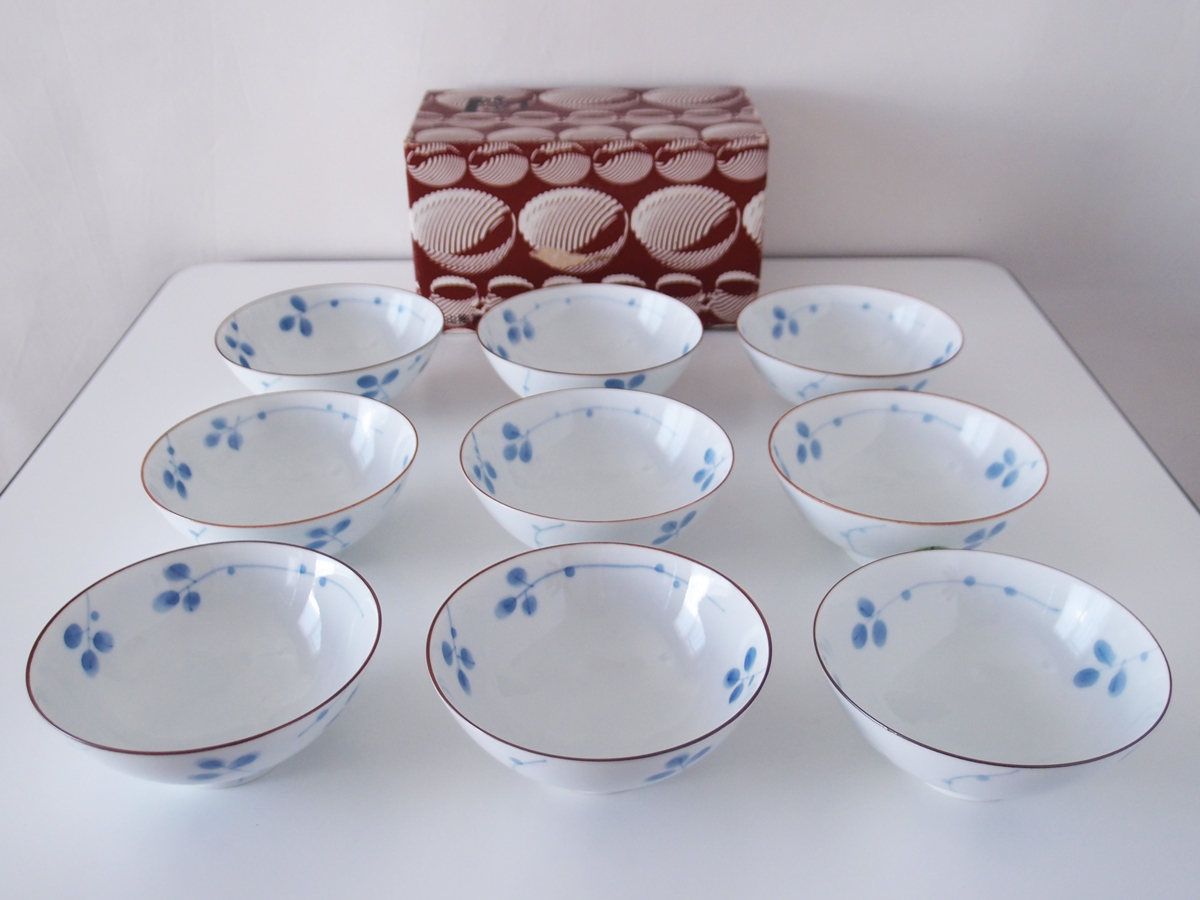 白山陶器 ビンテージ なずな 4寸飯碗 青 9客setの箱入り未使用品です。大体のサイズ:4寸飯碗 :口部直径12cm×高さ5.2cm。保管コンディション良好。※当時の商品の仕様か多少の歪み等ございます。現状ノークレームにてよろしくお願い致します。
