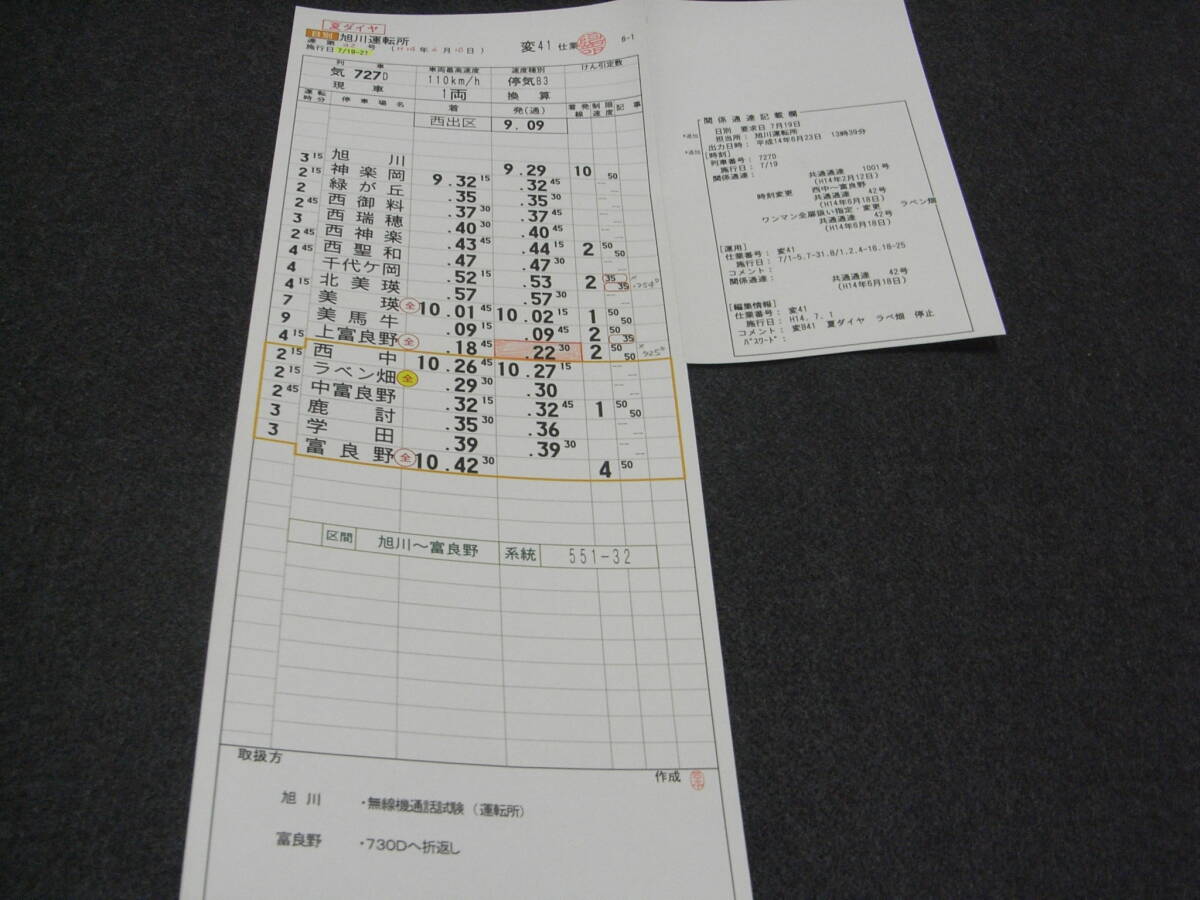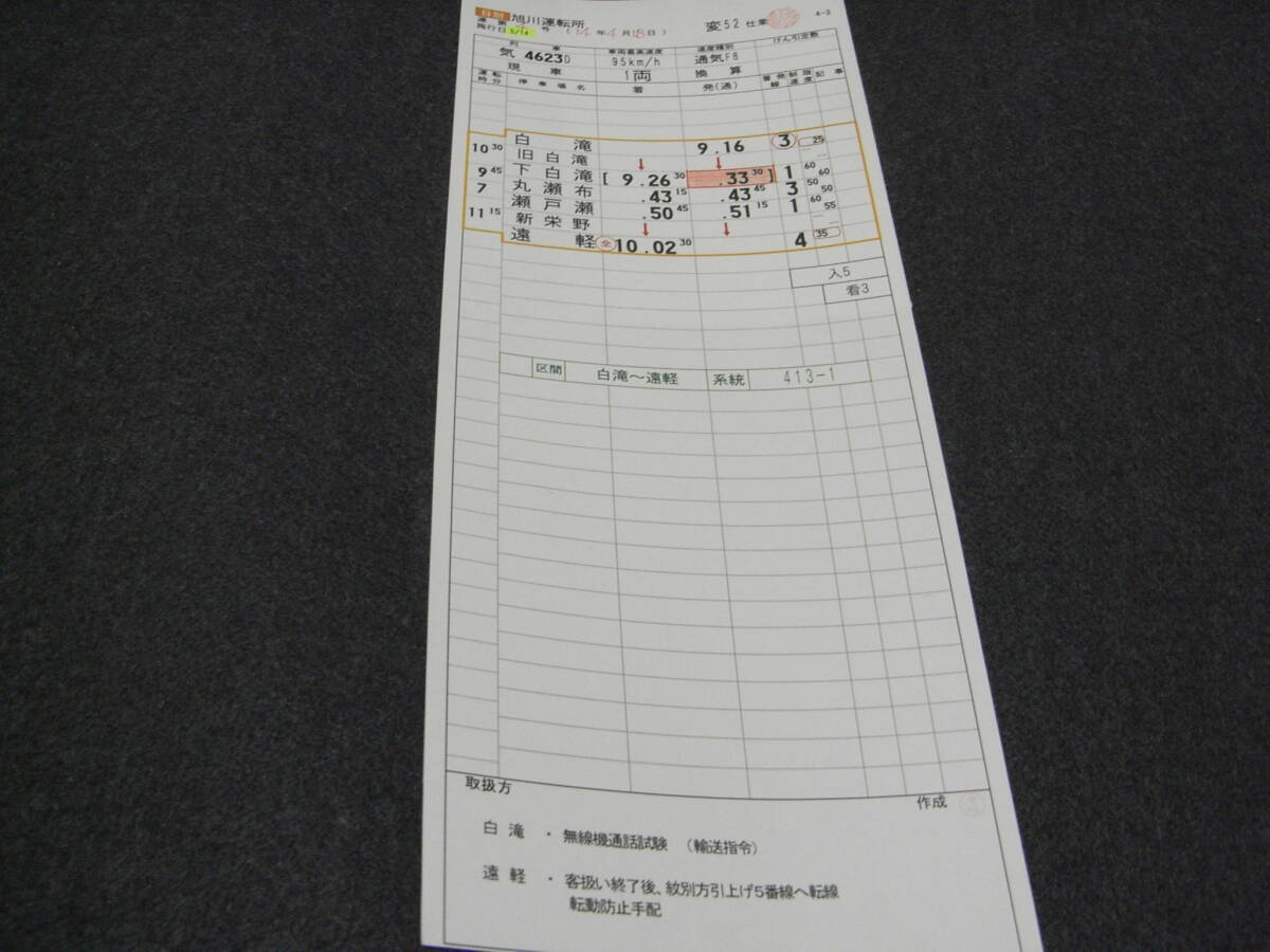 スタフ 石北本線 旭川運転所 変52仕業 気4623D 白滝-遠軽 施行日 平成14年5月14日●運転士時刻表